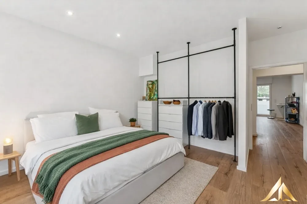 The bedroom is quietly situated and well-proportioned, allowing for versatile furnishing options. High-quality flooring and recessed ceiling spotlights emphasize the apartment’s well-kept overall condition.