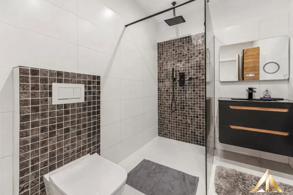 The separate kitchen is modern and functional, featuring clean lines, high-quality fittings, and ample workspace. The stylishly designed bathroom includes a walk-in rain shower and contemporary, elegant fixtures.
