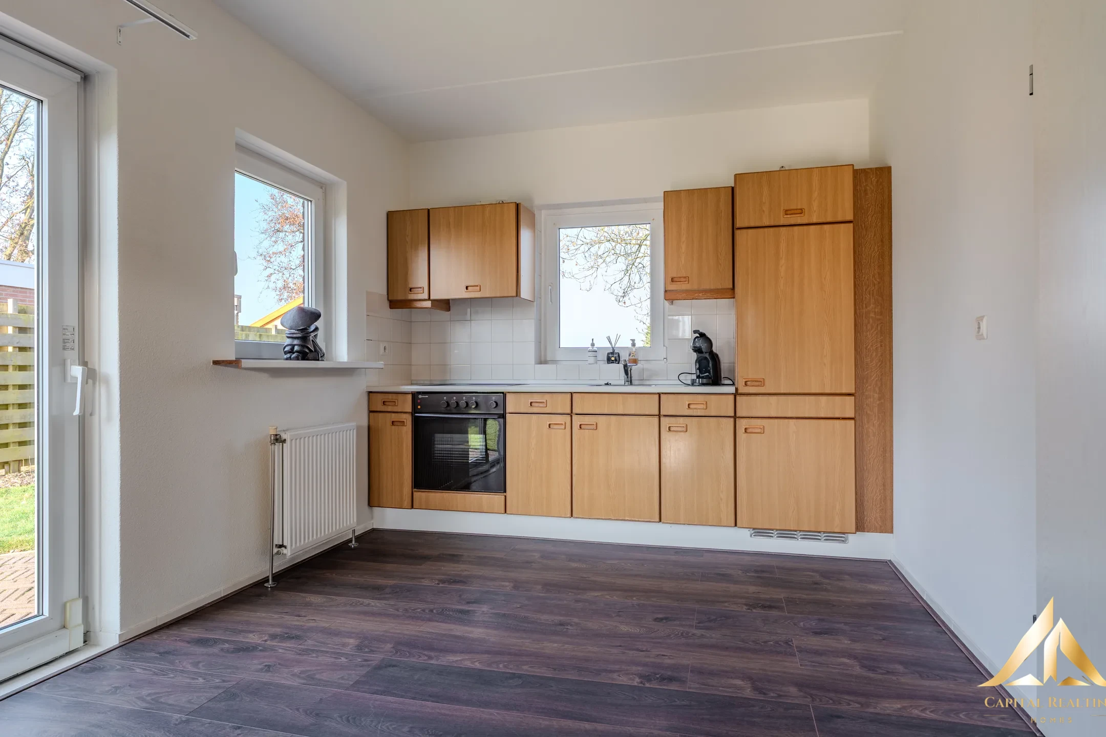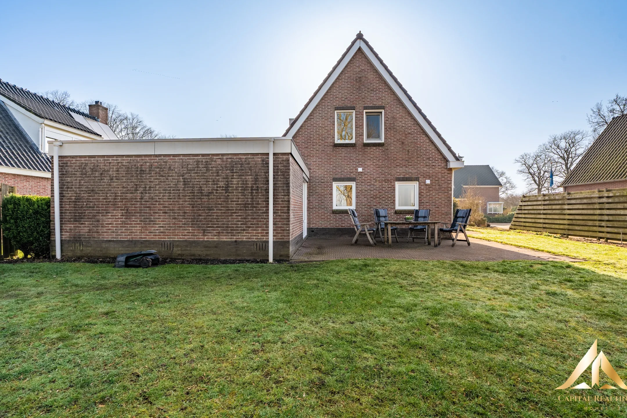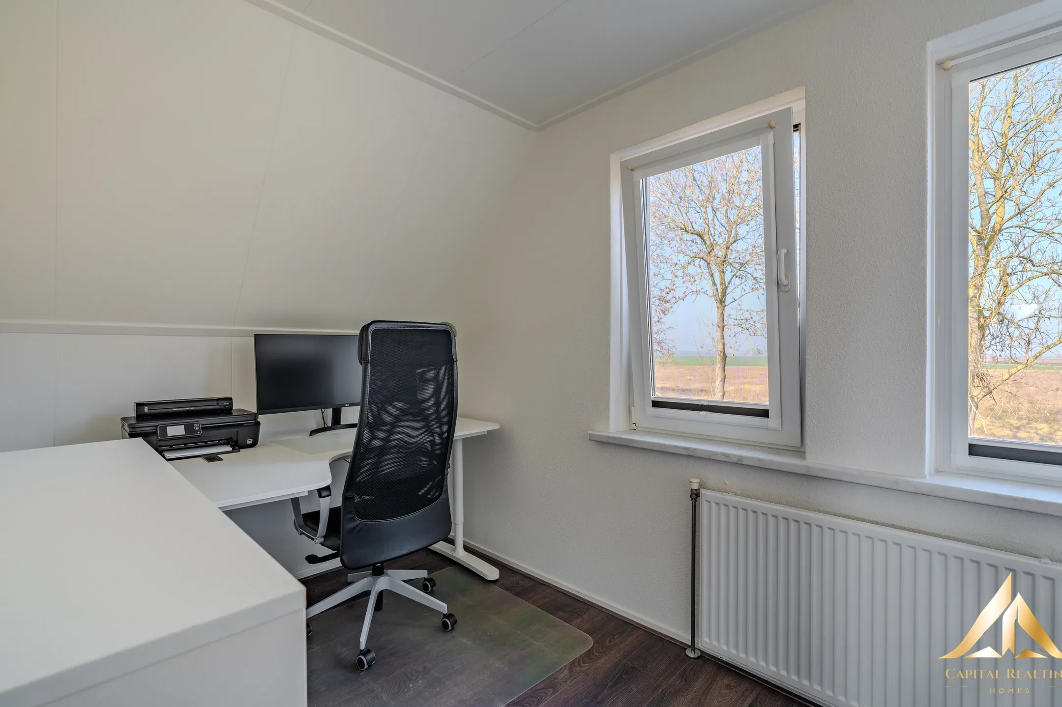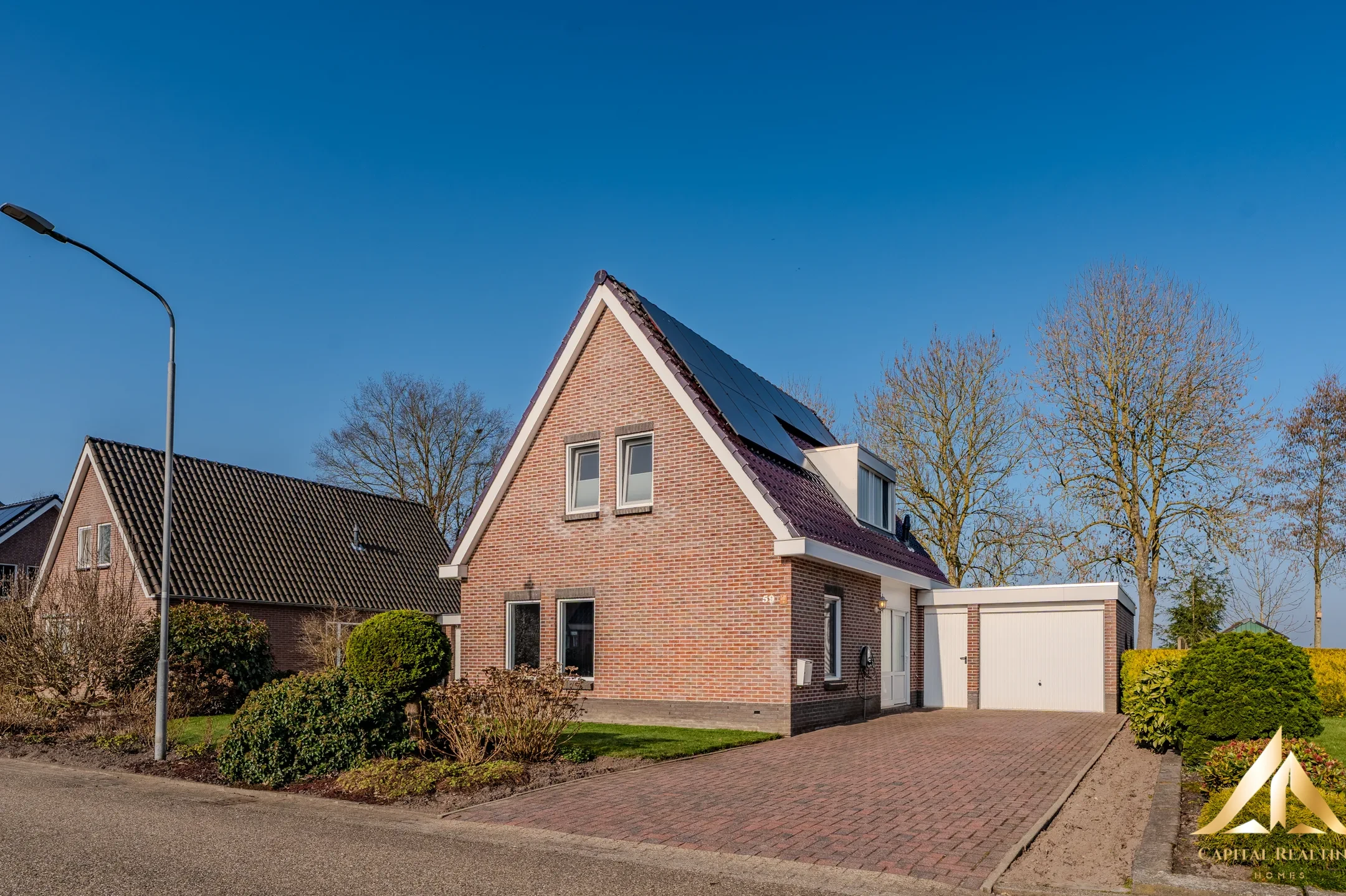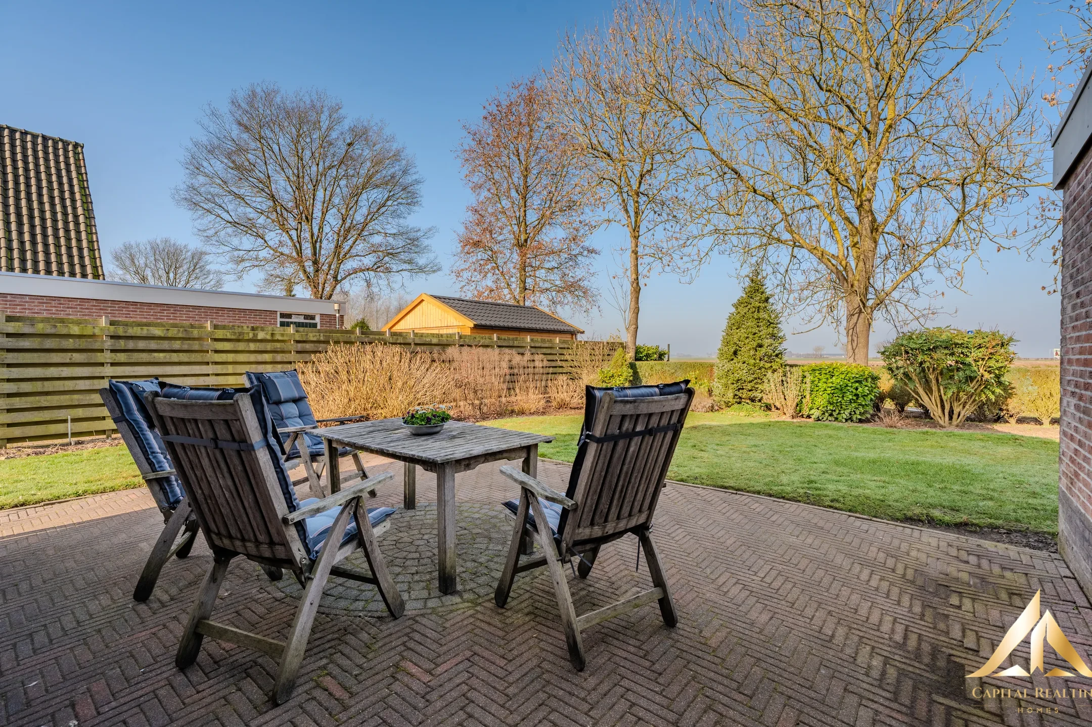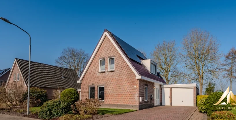 Are you looking for a low-maintenance house with a large garage, beautifully located, and with an unobstructed view over the countryside in a cozy neighborhood in Bellingwolde?, then this nice young house is for you! This energy-efficient house (label A) was built in 1997, is well maintained and is neatly inhabited. Layout: Ground floor: Entrance on the right side with stairs to the first floor, toilet, modern meter cupboard and access to the cozy living room with open kitchen with sliding doors and equipped with electric hob, oven and extractor hood. Through the central hall we enter the utility room with white goods connections, central heating cupboard and door to the garage with concrete floor and electric garage door. First floor: Via the staircase in the hall we reach the landing of the first floor, here are the three bedrooms and the bathroom with walk-in shower, sink and toilet. Attic: Through a hatch in the master bedroom we enter the attic. Garden: In the spacious garden are the ornamental garden at the front and the sun terrace with beautiful unobstructed views over the countryside at the rear. Particularities: -Low-maintenance and energy-efficient living; -Detached with large garage; -Two dormer windows; -Spacious garden with rural views; -Beautifully secluded location in a popular neighborhood; -Central heating Intergas (2025) with radiators; -Plastic frames with insulating glazing; -Plastic gutters and ceramic roof tiles; -Solar panels 20 pieces on east and west side so always yield; -Energy label A.