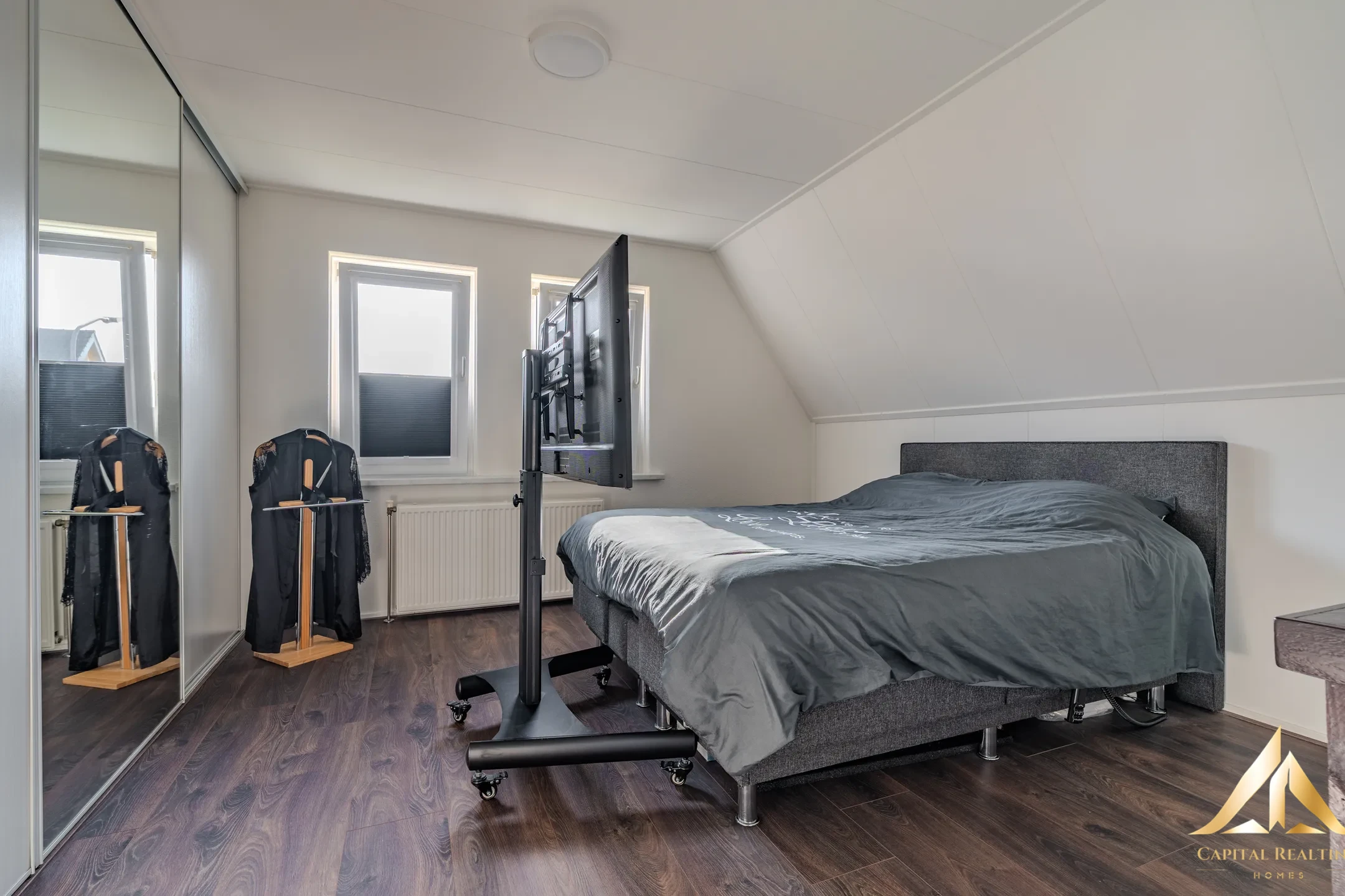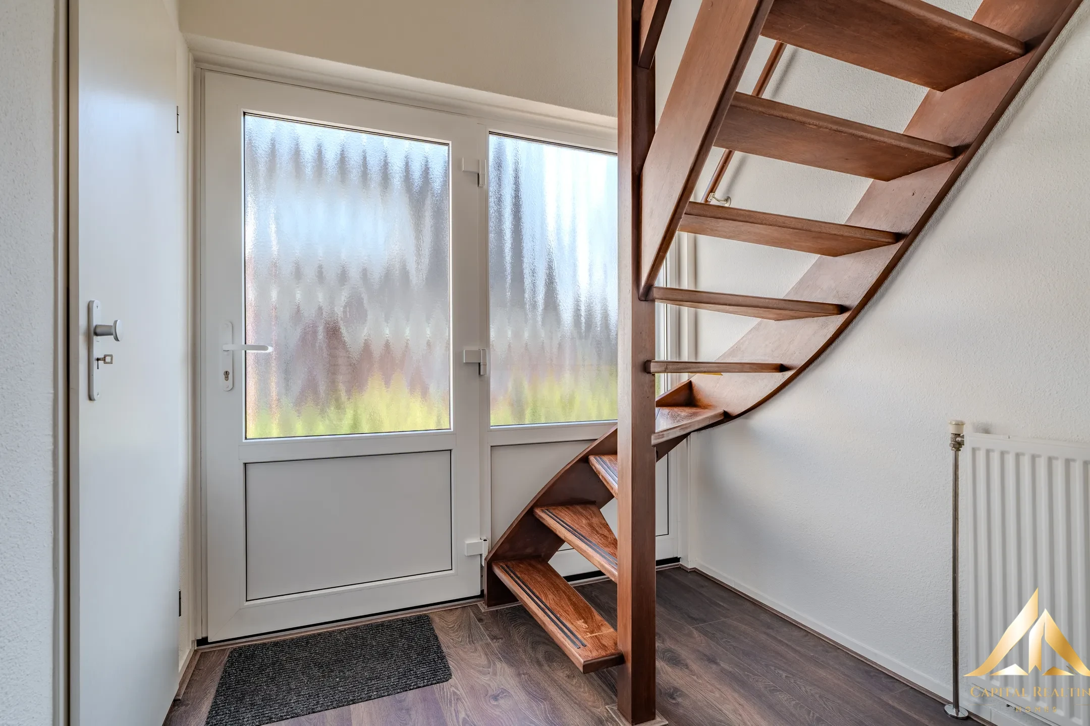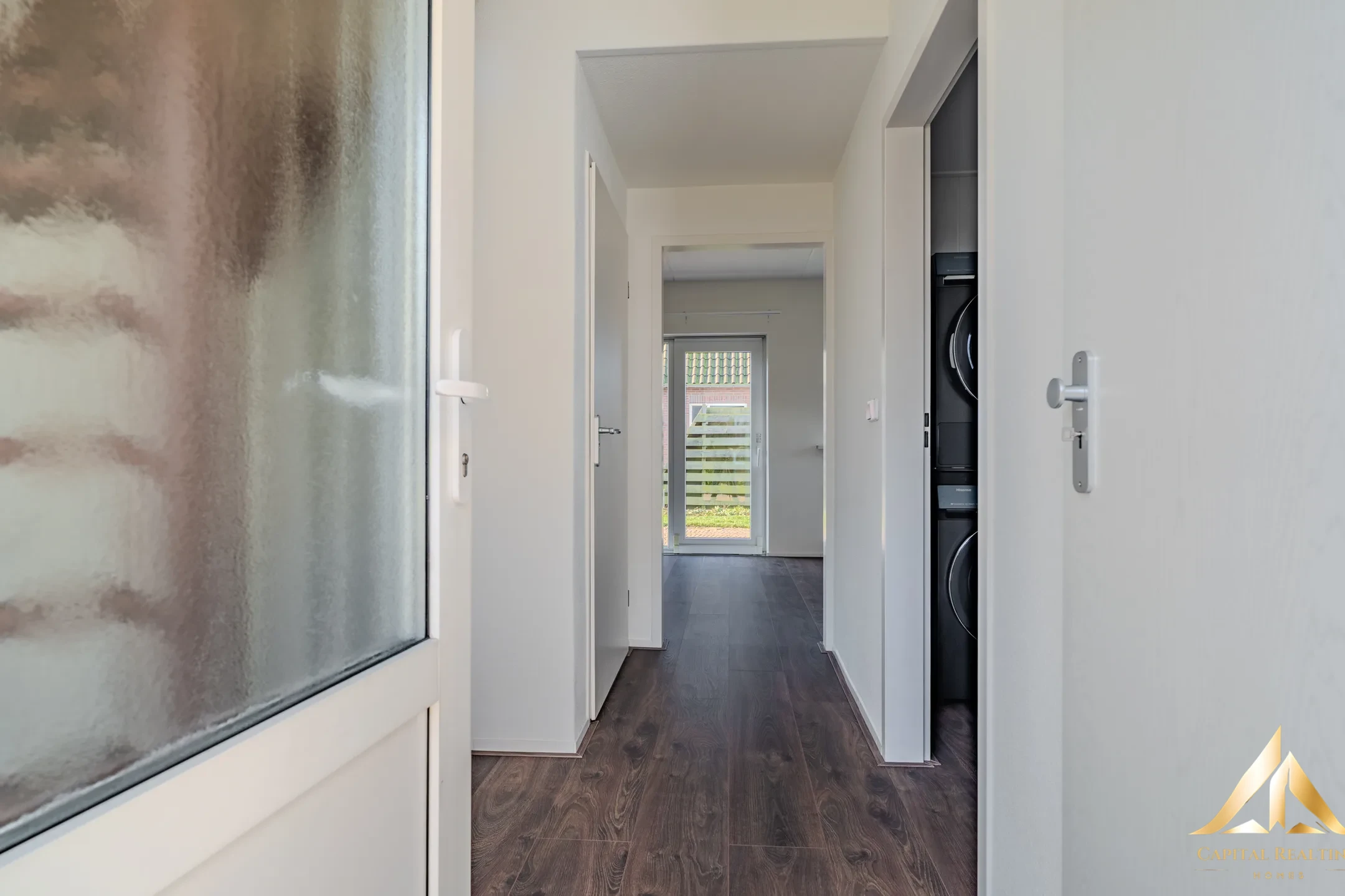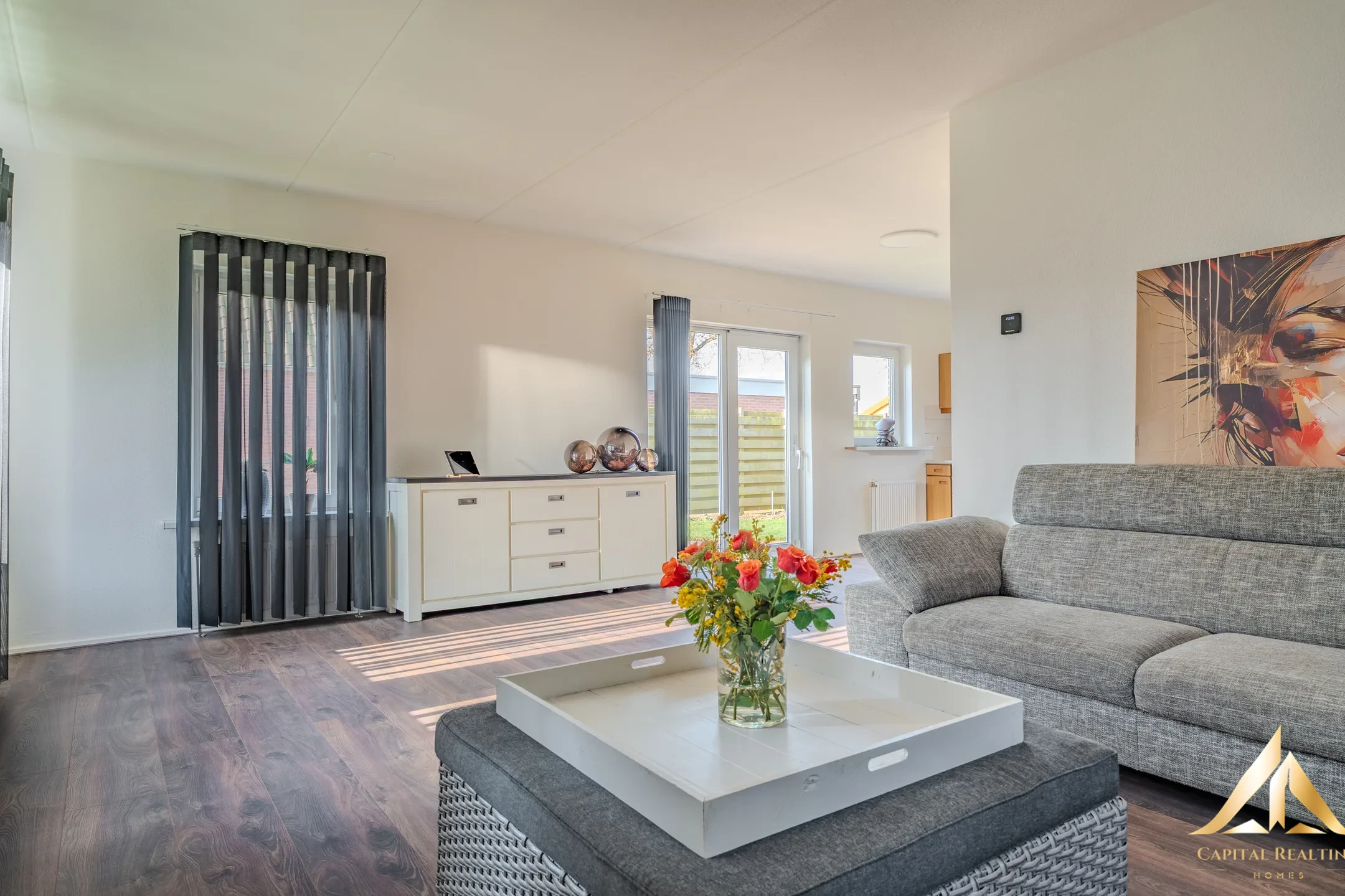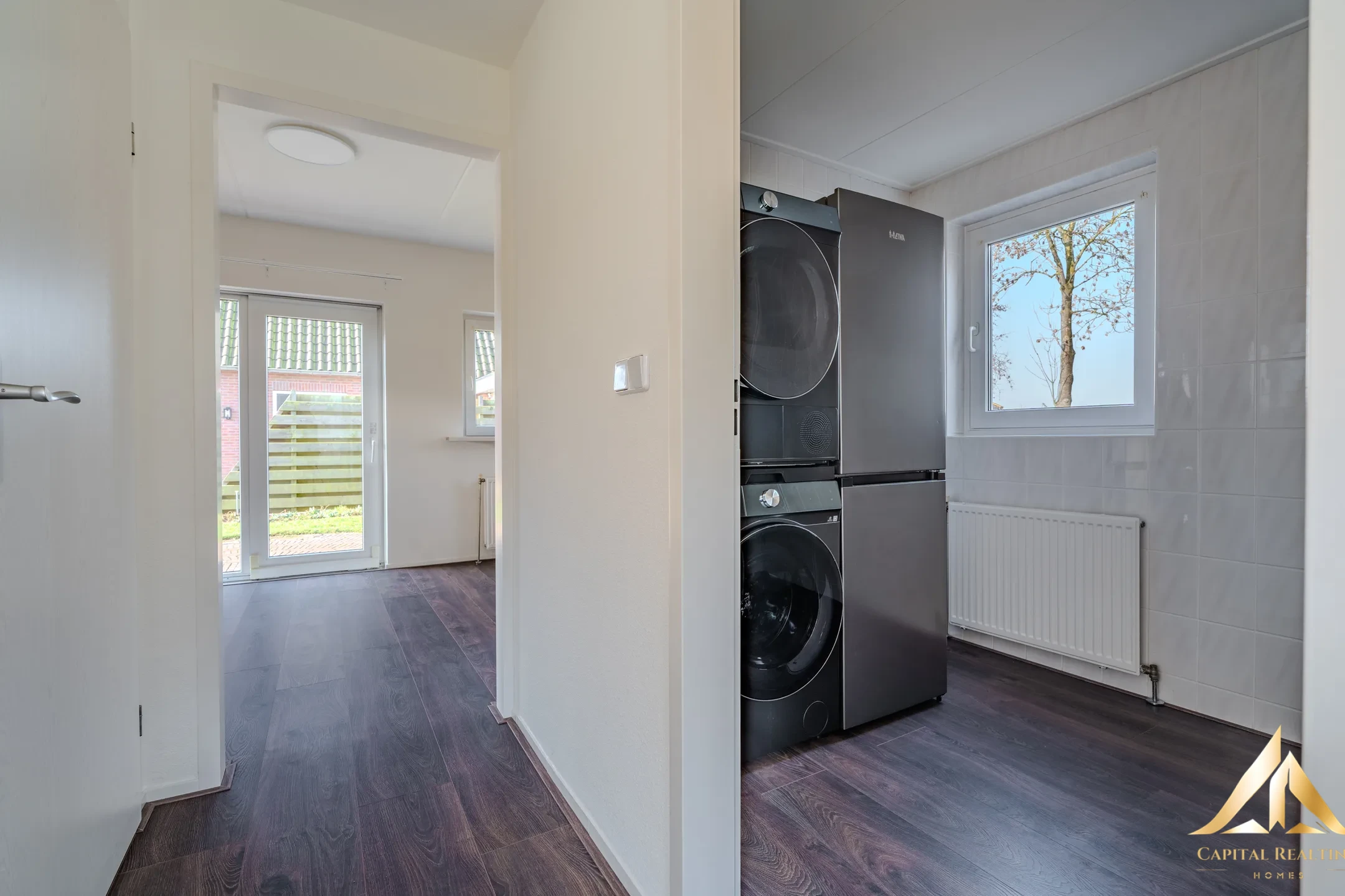 Are you looking for a low-maintenance house with a large garage, beautifully located, and with an unobstructed view over the countryside in a cozy neighborhood in Bellingwolde?, then this nice young house is for you! This energy-efficient house (label A) was built in 1997, is well maintained and is neatly inhabited. Layout: Ground floor: Entrance on the right side with stairs to the first floor, toilet, modern meter cupboard and access to the cozy living room with open kitchen with sliding doors and equipped with electric hob, oven and extractor hood. Through the central hall we enter the utility room with white goods connections, central heating cupboard and door to the garage with concrete floor and electric garage door. First floor: Via the staircase in the hall we reach the landing of the first floor, here are the three bedrooms and the bathroom with walk-in shower, sink and toilet. Attic: Through a hatch in the master bedroom we enter the attic. Garden: In the spacious garden are the ornamental garden at the front and the sun terrace with beautiful unobstructed views over the countryside at the rear. Particularities: -Low-maintenance and energy-efficient living; -Detached with large garage; -Two dormer windows; -Spacious garden with rural views; -Beautifully secluded location in a popular neighborhood; -Central heating Intergas (2025) with radiators; -Plastic frames with insulating glazing; -Plastic gutters and ceramic roof tiles; -Solar panels 20 pieces on east and west side so always yield; -Energy label A.