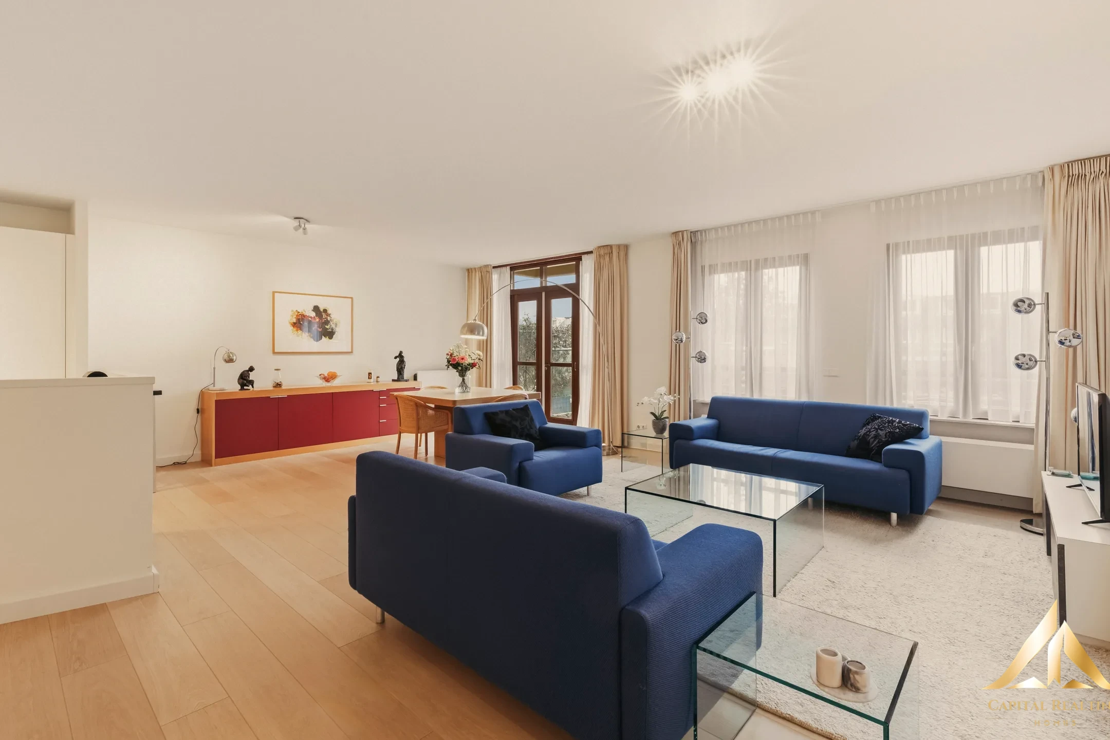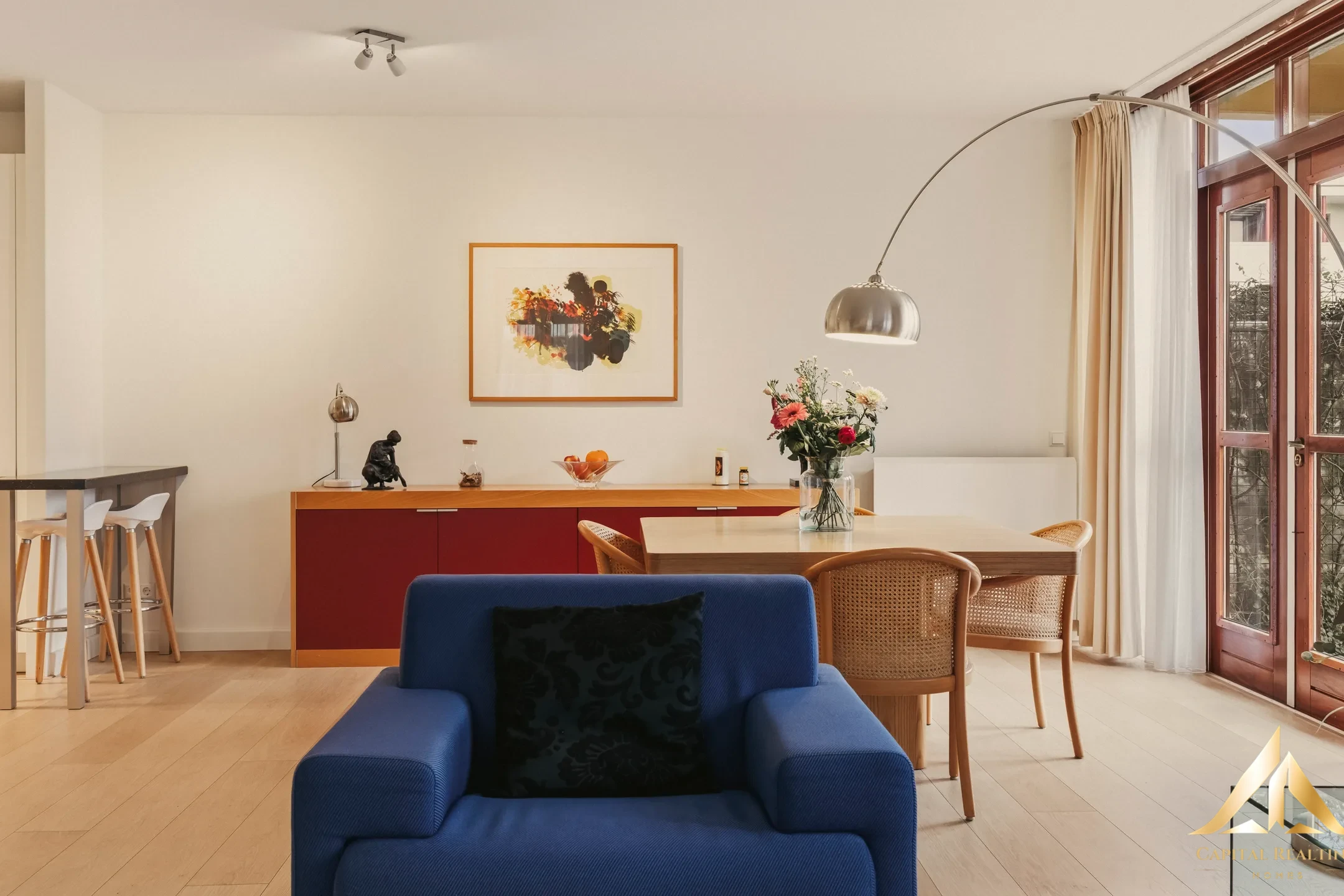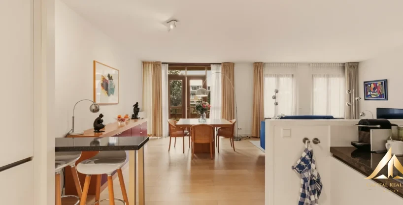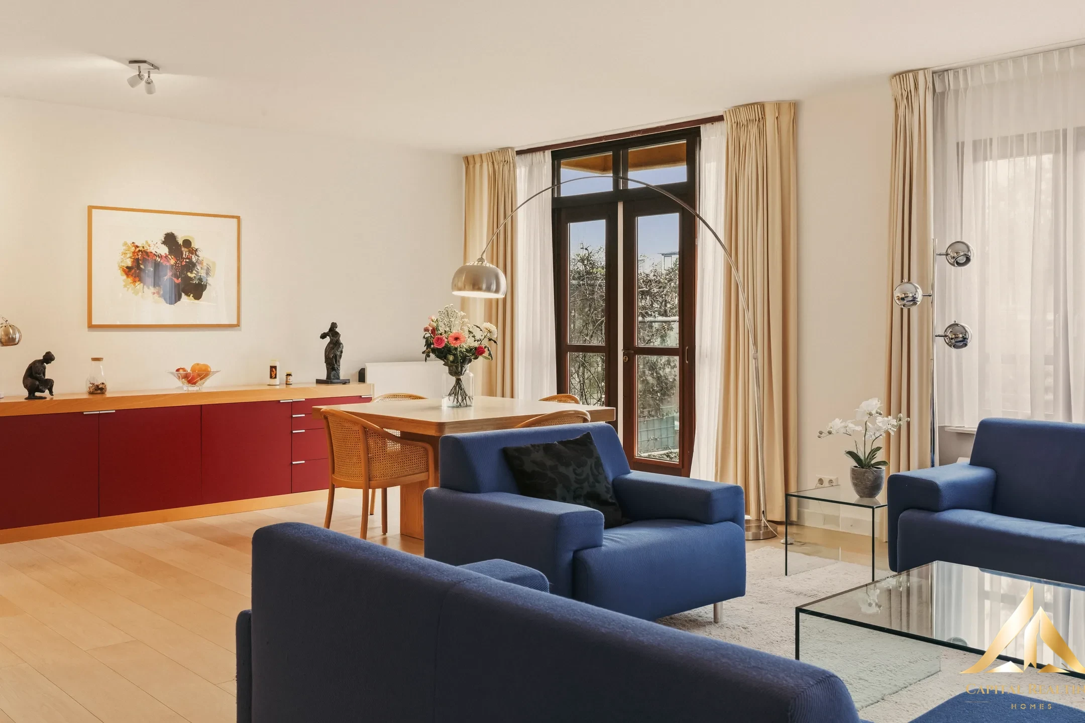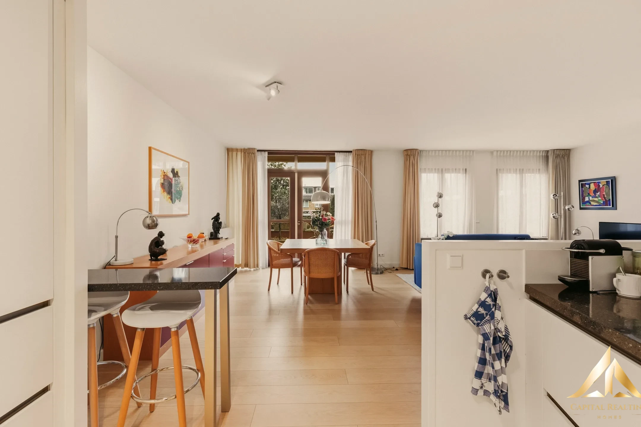 Would you like to live in comfort, in the middle of the bustling city center of Amstelveen? This beautiful 3-room apartment on the ground floor of the exclusive Cortile complex offers the best of both worlds: peace and privacy with all amenities within walking distance. The apartment is uniquely situated on the beautifully landscaped courtyard and has a lovely sunny south-facing terrace. Thanks to the convenient location and the patio doors to the terrace, you can enjoy a bright, attractive living room with a pleasant connection between inside and outside. Layout Through the luxurious central entrance you reach the apartment almost immediately. The spacious hall gives access to all rooms. The spacious living room is characterized by the large windows and the fine light. The open kitchen is fully equipped with an oven, gas hob and fridge/freezer. Adjacent is a practical utility room with space for the washing machine, dryer and central heating system. The house has two comfortable bedrooms, each with its own bathroom. The master bedroom has an en-suite bathroom with bath, shower and double sink. The second bedroom also has its own bathroom with shower and sink.