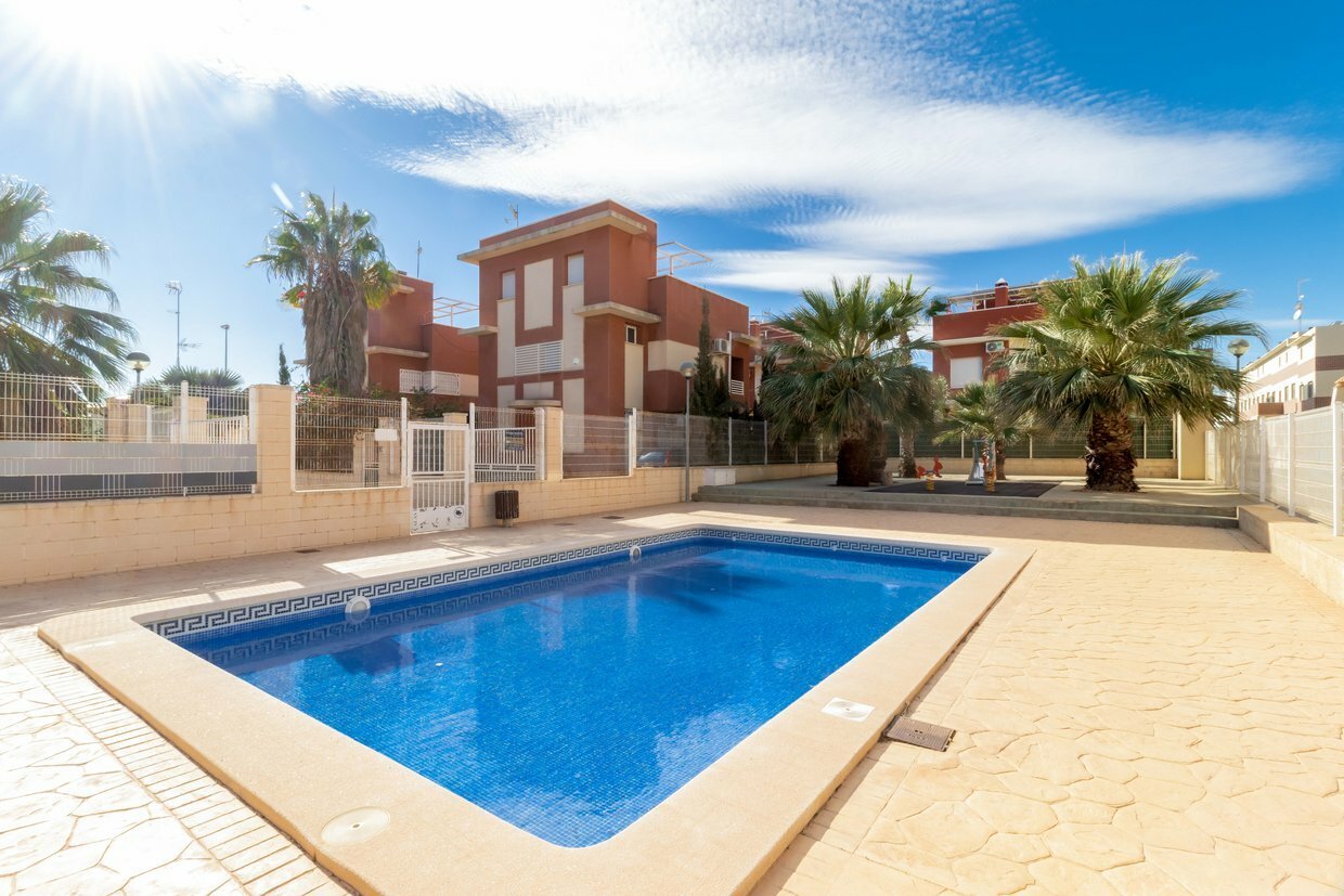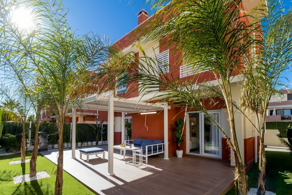 For sale fully renovated villa in the area of Las Lomas de Cabo Roig, with an area of 123 m2. On the ground floor of the house there is a living room combined with a kitchen, a toilet, a room where the washing machine and water heater are located. Electric blinds are installed on the windows of the first floor. The staircase to the second and third floors has automatic lighting. On the second floor there are three bedrooms and two bathrooms. One of the bedrooms is combined with a bathroom. One of the bedrooms has access to a balcony with a view of the pool. On the third floor there is a roof area equipped for relaxation, with loungers and a panoramic view.