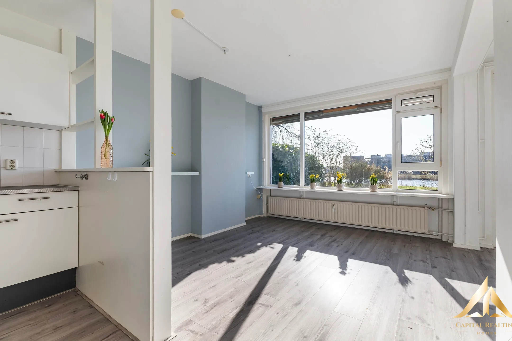 2-room apartment is located on the ground floor on the southern edge of the city. With a front garden on the northeast and a backyard on the southwest. You look out on the beautiful Van Harinxma Canal and see the boats pass by all year round. Various facilities are available in the vicinity, including schools, shopping center, sports fields and an excellent public transport connection to the city center within walking distance. The Nijlân district is characterized by the large amount of greenery and is conveniently located in relation to the roads to Heerenveen and Drachten. Ground floor: – Entrance hall – Left side is the indoor storage room (approx. 5m2) with electricity, central heating system and washing machine connection – Right side the bedroom (approx. 10m2) – The bathroom has a corner shower with sink and toilet; – Semi-open kitchen (approx. 4m2), living room (approx. 26m2) with former bedroom which is involved in the living room. The outside door gives access to the backyard with an unobstructed view of the Van Harinxma Canal.