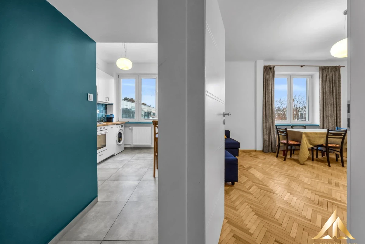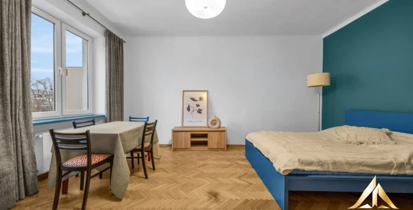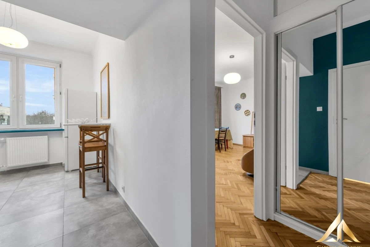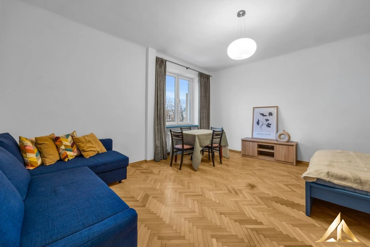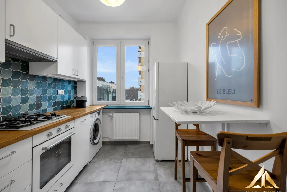 We offer a functional, fully furnished apartment located in a charming tenement house from 1956. The apartment features a bright living room with a south-western exposure, a separate kitchen, a bathroom with a shower, and a hall. High standard finishes, wooden parquet flooring, and tiles in the bathroom and kitchen add to its appeal.