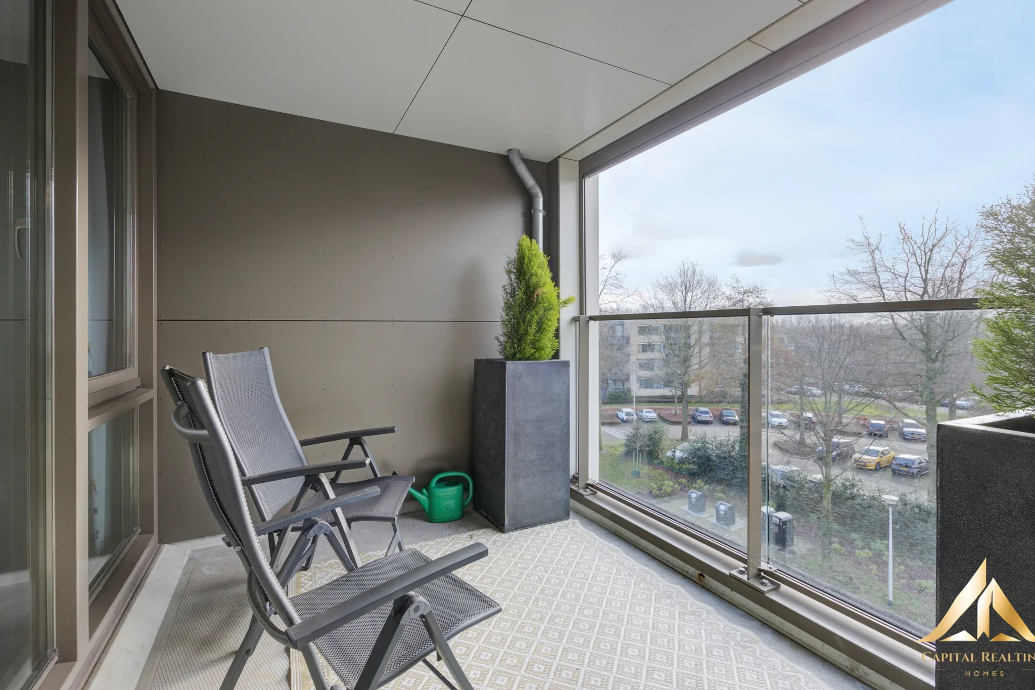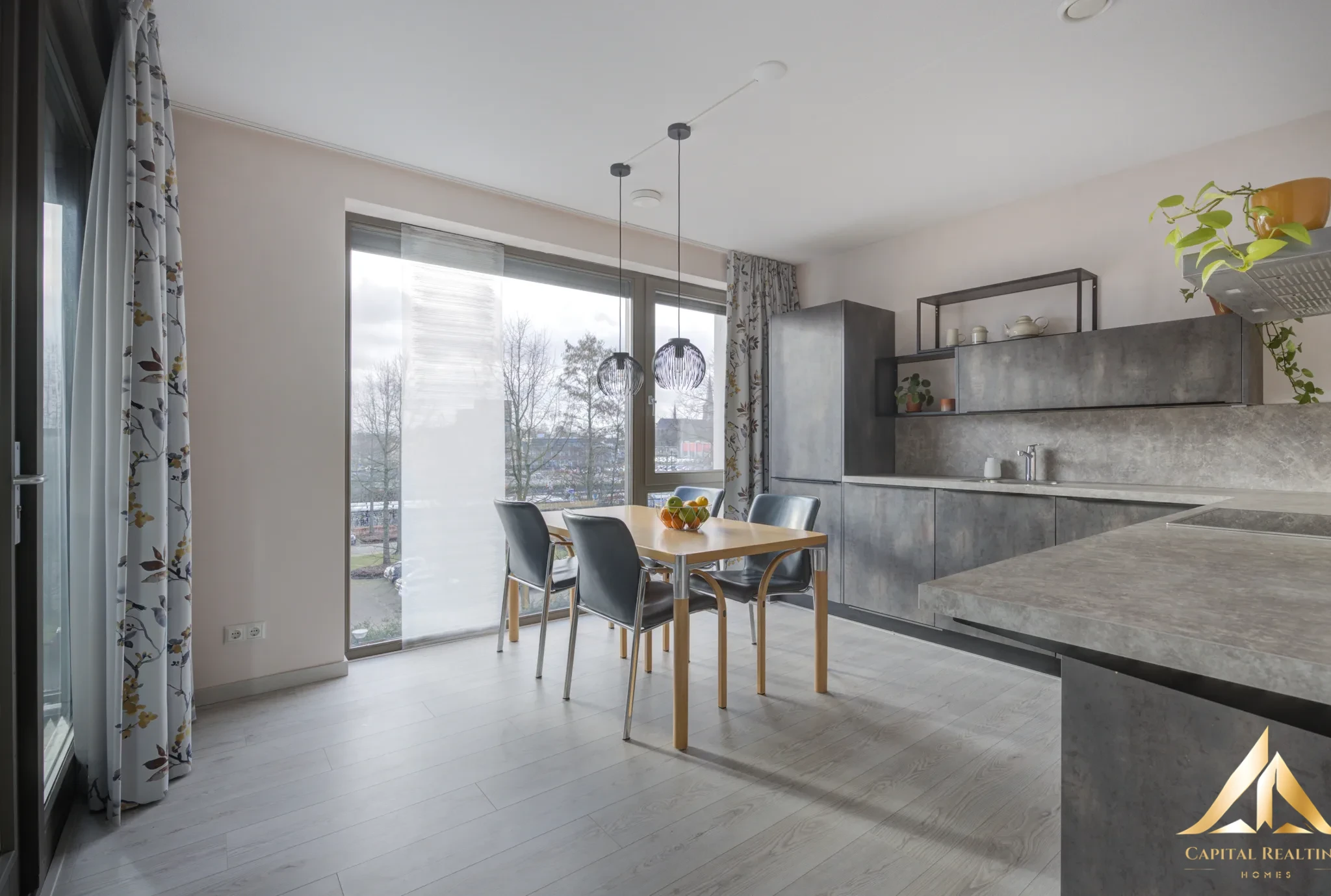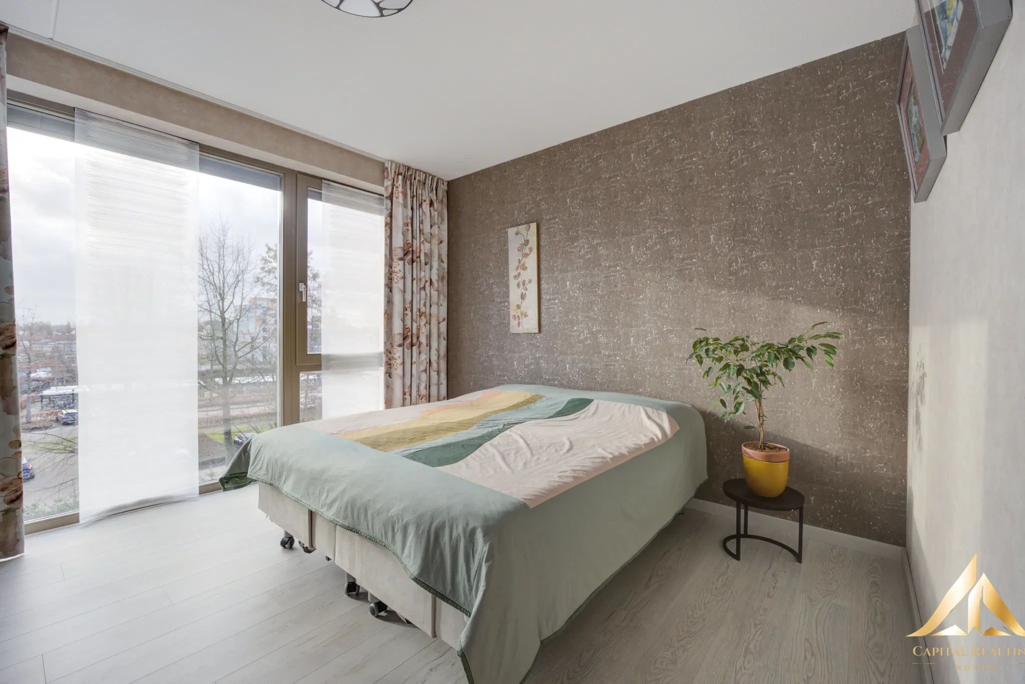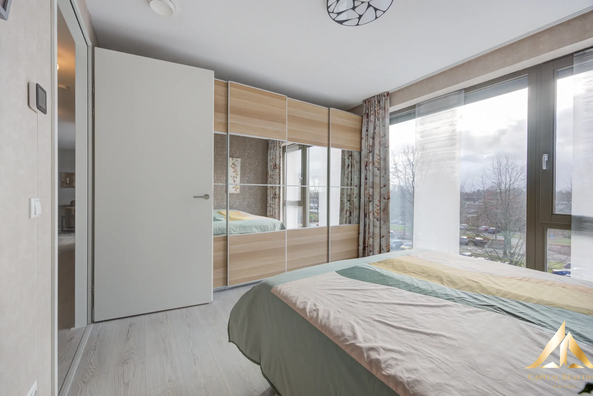 Are you looking for a ready-to-move-in 2-room apartment with various amenities within easy reach? Then don’t skip this apartment at Zonnestad 77! Here you have a living room with open kitchen, a bright, spacious bedroom and a neat bathroom. In addition, a spacious indoor balcony that faces south. So here you can enjoy the sun! The apartment is also very energy efficient, because it is gas-free, fully insulated, equipped with 7 solar panels and underfloor heating. The cozy center of Etten-Leur with many amenities is also nearby and the railway station within walking distance. Have you become curious? Contact our office and we will be happy to schedule a viewing with you! Central entrance: Entrance with doorbells, intercom system and mailboxes, staircase and elevator installations that provide access to the third floor where the apartment is located. Layout apartment – living room with open kitchen, bright bedroom and neat bathroom We enter the apartment through the hall, which gives access to all rooms. Here you will find the partly tiled toilet room (with floating toilet and fountain), the storage room, the living room, the bedroom and the bathroom. The living room with open kitchen is the heart of the apartment. A sitting and dining area has been created here. Thanks to the open layout and the pleasant light, you will experience a wonderful spacious feeling here. Cooking, dining and relaxing merge effortlessly here. The kitchen is designed in a corner unit and has plenty of cupboard space, a 4-burner induction hob with extractor hood, a refrigerator, a freezer, a dishwasher, a sink and a plastic worktop. From the kitchen you step directly onto the indoor balcony. From the hall you reach the storage room. Here, the heat pump, the heat recovery system, the connections for the washing equipment and the inverter of the solar panels are neatly arranged. Practical and out of sight. The bedroom is spacious and wonderfully light thanks to the large windows. A pleasant place to start the day relaxed when the first rays of sunshine fall in. The neat bathroom has a walk-in shower, a sink with a furniture, a floating toilet and a design radiator. Balcony The indoor balcony is located on the sunny south, so you can enjoy the sun to the fullest. A wonderful place to relax after a long day. Parking space and storage room The apartment has its own parking space with storage in the parking basement. This way you are always assured of a parking space. The storage room is equipped with lighting and electricity, ideal for extra storage or charging, for example, an (electric) bicycle.