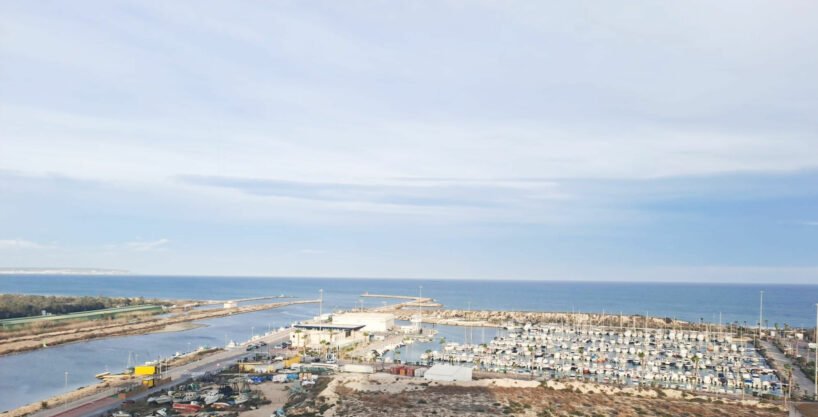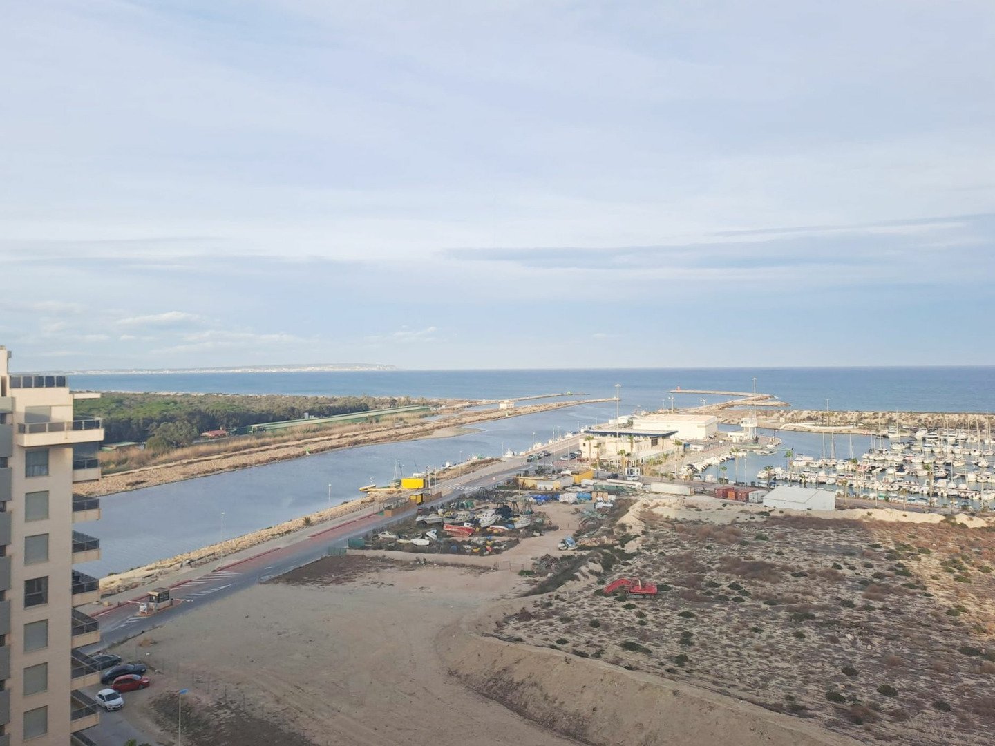 An apartment is for sale on the top floor of a multi-storey building, featuring a private rooftop area (solarium). The property is located in the town of Guardamar del Segura and has a total area of 106 m². The apartment offers three bedrooms, two bathrooms, a living room, a separate kitchen with utility room. The living room opens onto a terrace with views of the town’s marina. A spiral staircase in the living room leads up to the roof, which boasts panoramic views of the sea, the town, and the park.