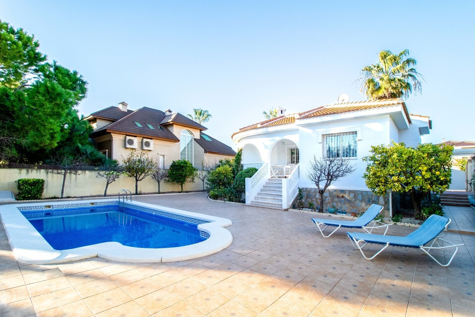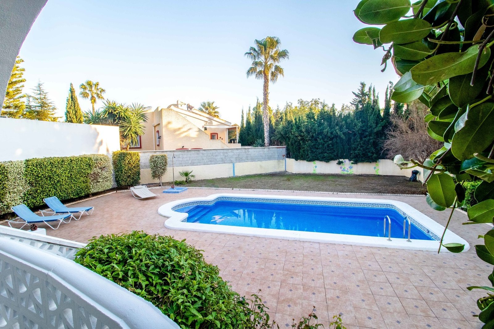 Huge yard of 615 m2 with a garden (palms, rose garden, live hedge), private swimming pool, barbecue area, and parking space for a car.