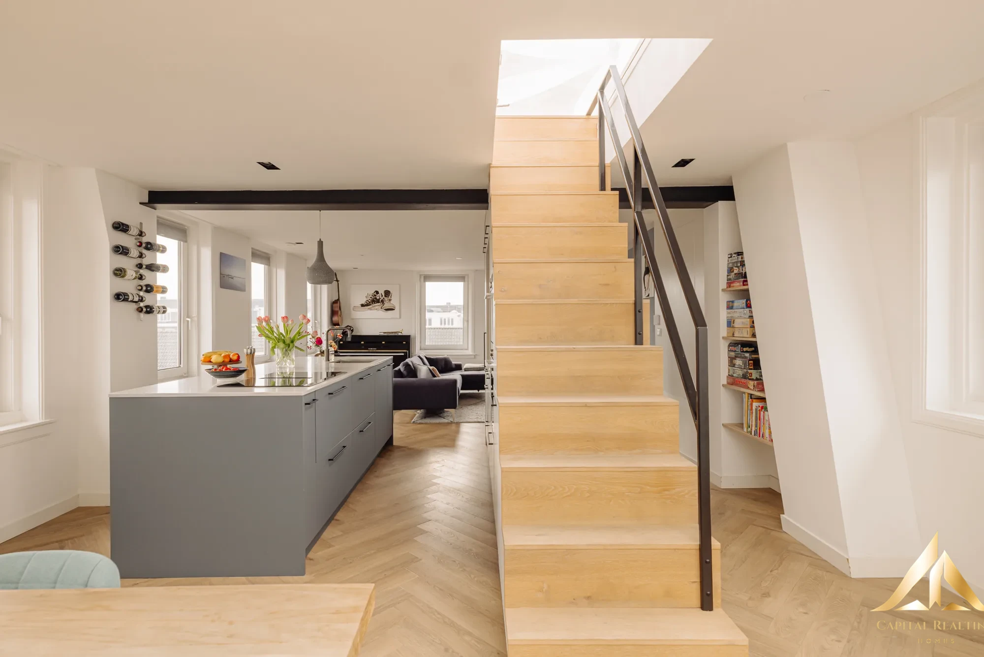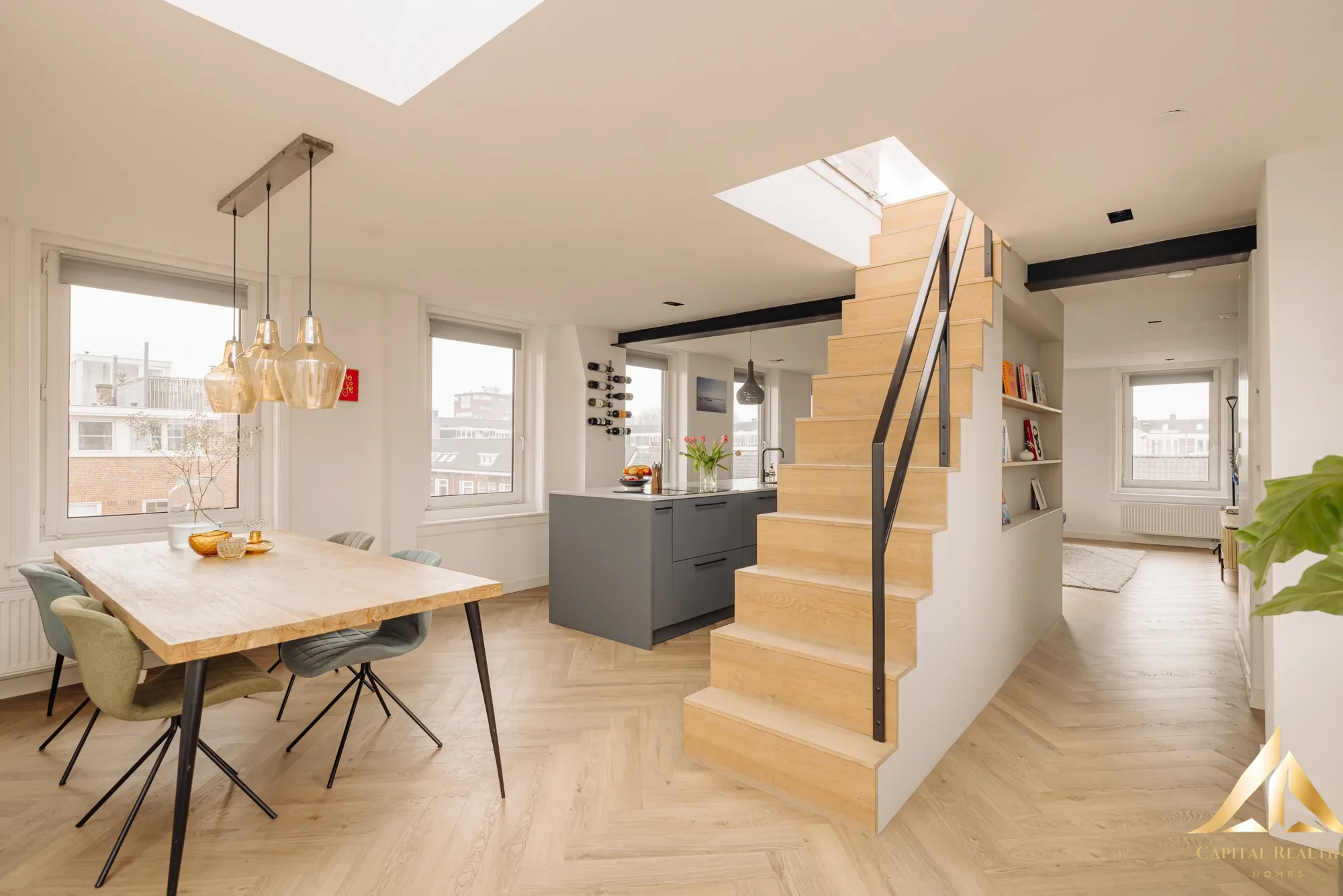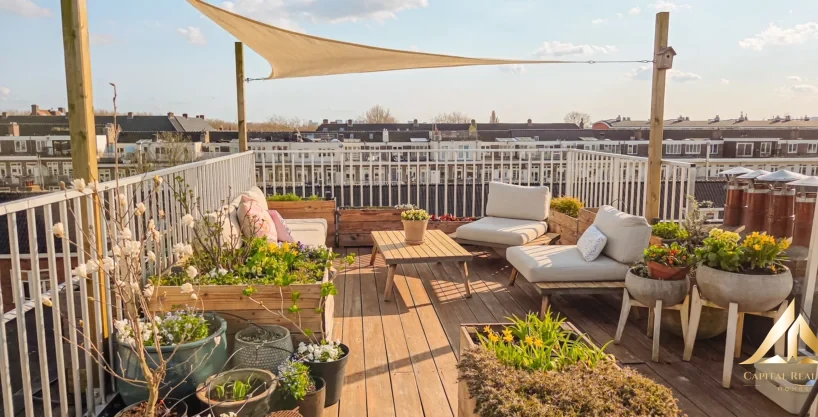 Rare in Amsterdam West! This beautifully finished upper corner house of 116 m² is spread over two floors (3rd and 4th floor) with an exceptionally spacious, beautifully landscaped roof terrace above. Thanks to the high corner location, you can enjoy enormous light and a spectacular panoramic view of the city. Completely renovated in 2021, this house combines space, comfort and style in a fantastic location! The apartment has a spacious and bright living floor (with air conditioning) with luxurious open kitchen and cooking island on the 4th floor and no less than three well-sized bedrooms and a stylish bathroom on the 3rd floor. The master bedroom has a beautiful, characteristic bay window and air conditioning has also been installed here. Another big plus: the leasehold has been bought off in perpetuity, so no financial surprises in the future!