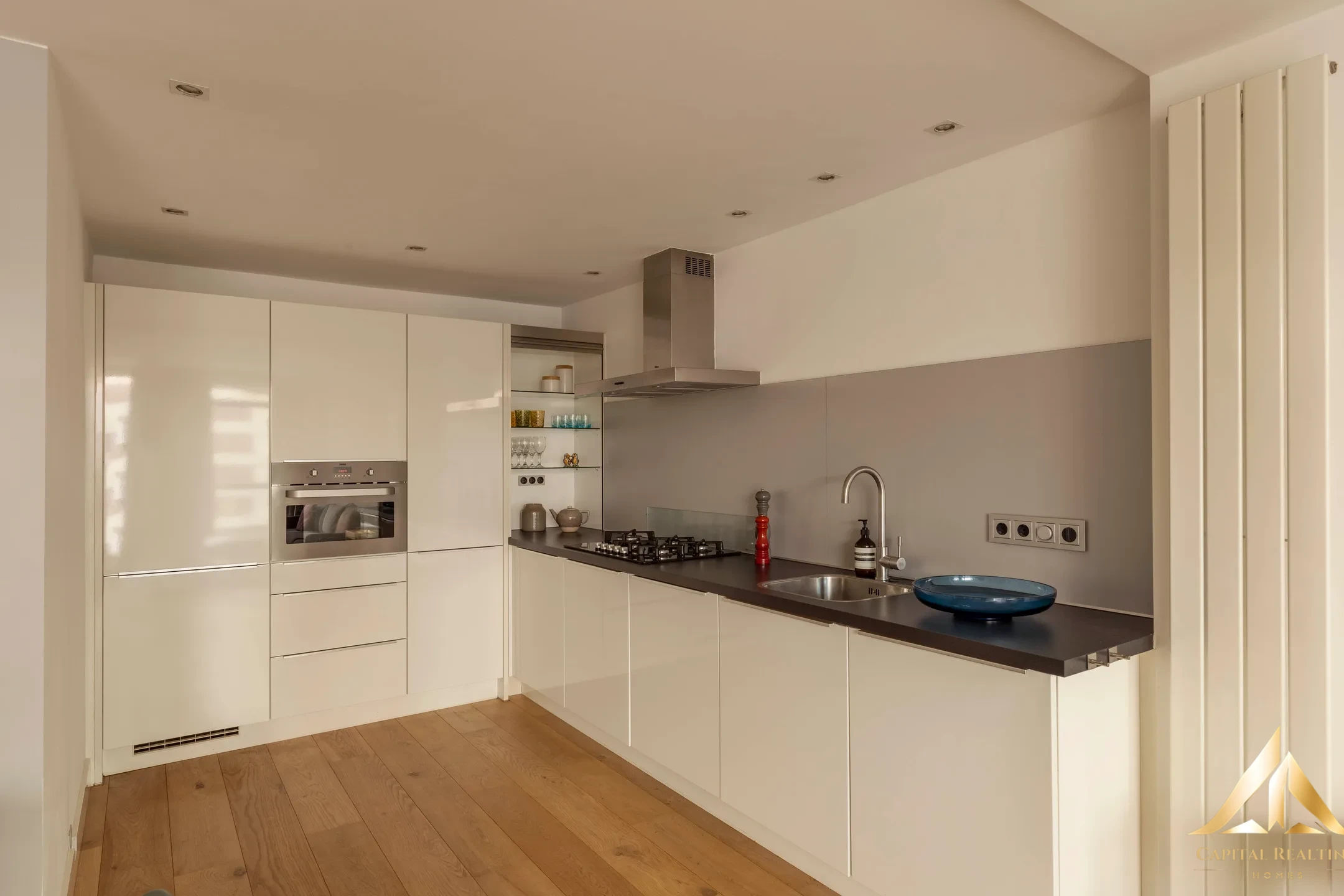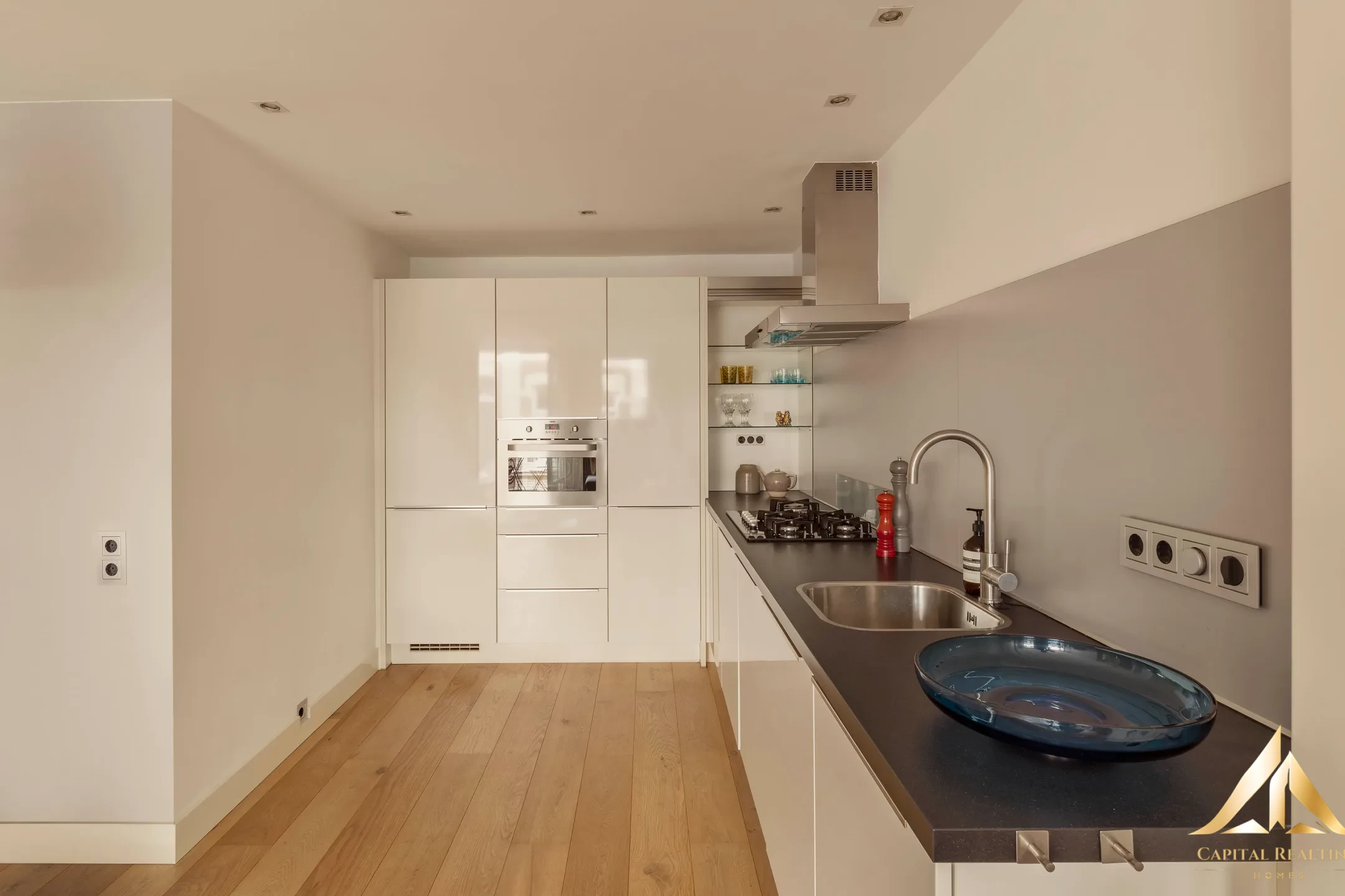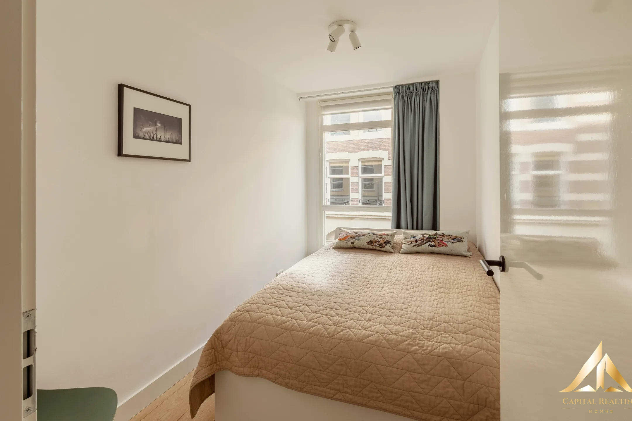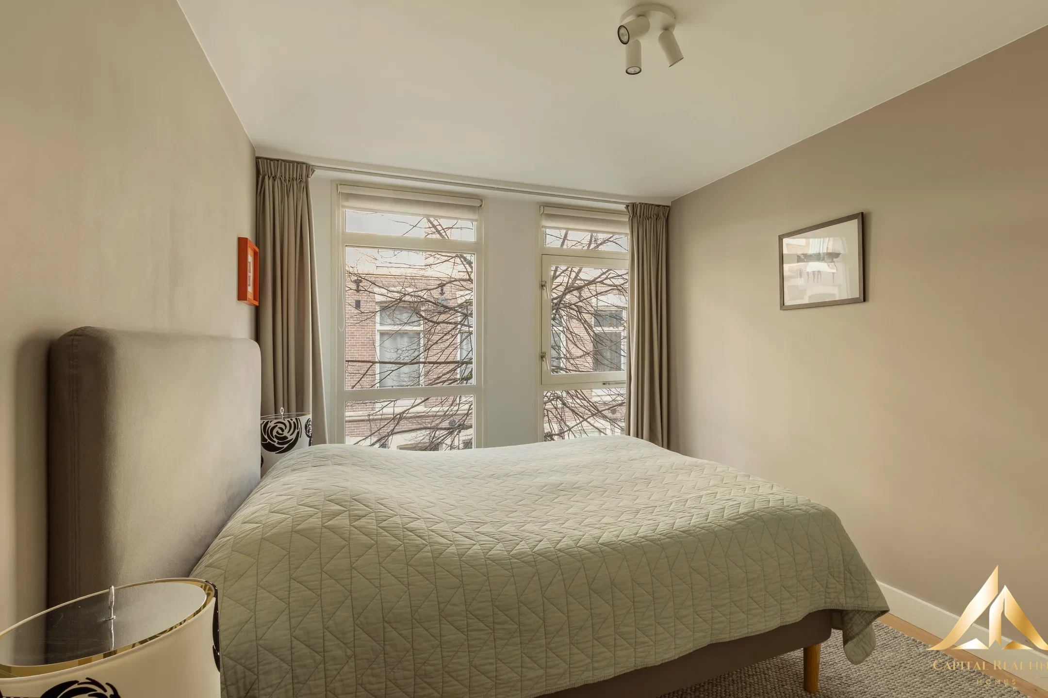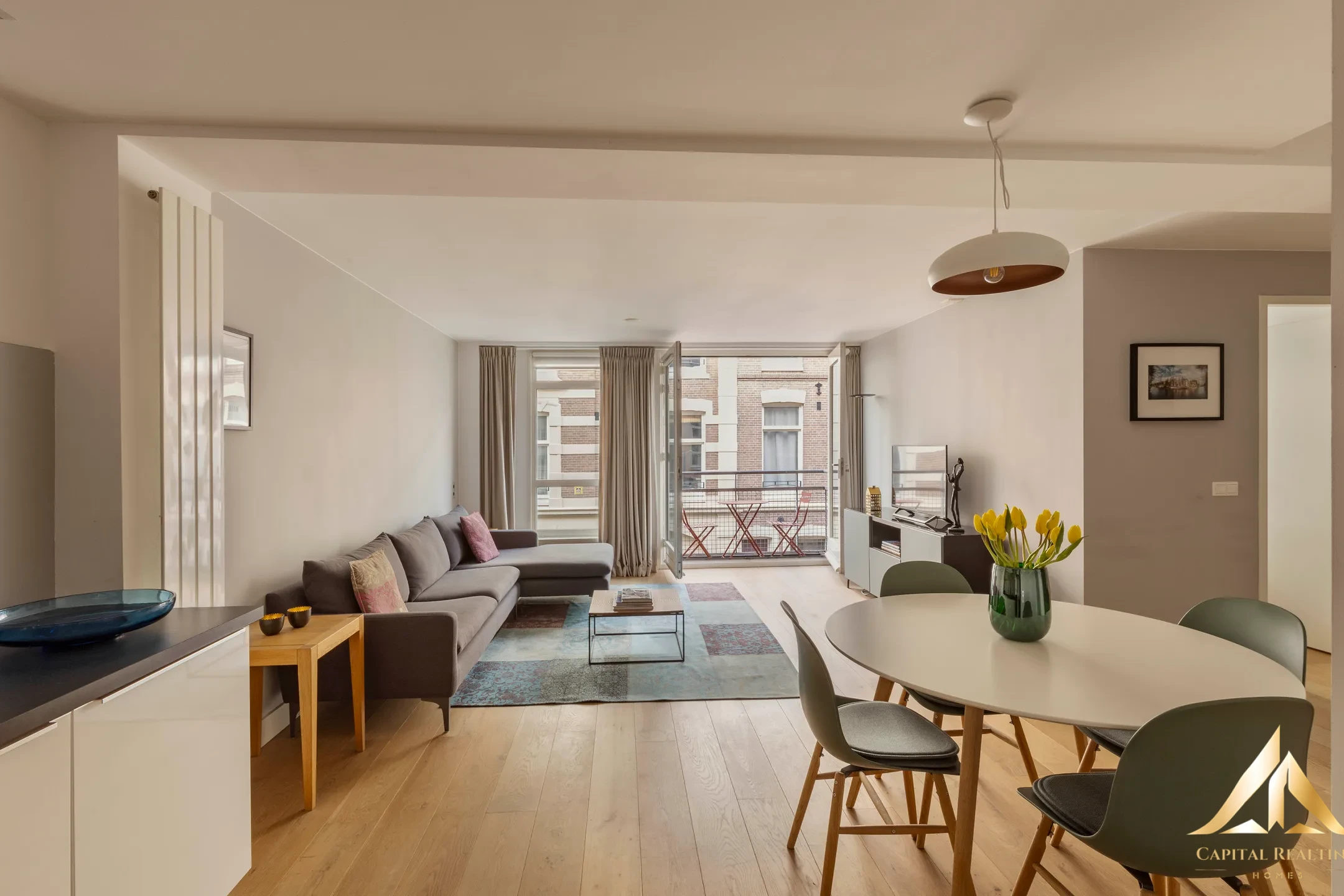 This well-laid out apartment of approximately 67 m² with two bedrooms and a balcony, located on the first floor of a well-kept residential building, is located in the quiet Rustenburger neighborhood in the popular Pijp neighborhood. The house has a spacious and bright living and dining room with large windows and an open kitchen. There is a beautiful wooden floor throughout the apartment. In addition, there is a private storage room and a shared bicycle shed. The apartment is located on private land. A parking space is also offered with the house, for sale separately for € 75,000,-. A short distance away are the Van Woustraat and the Amstel. Layout: Through the central entrance of the building, the communal hall is reached, which gives access to the courtyard garden. From here, the staircase leads to the first floor where the entrance to the apartment is located. The house opens into a hall that provides access to the various rooms. At the front is the living and dining room, a spacious and bright living space with large windows that provide pleasant light. The width of the space makes it possible to enjoy a comfortable seating area and a generous dining area. From the living space, patio doors give access to the balcony, a pleasant outdoor space overlooking the quiet street. At the rear is the luxurious open kitchen, equipped with various built-in appliances, including an oven and a five-burner gas hob with separate extractor hood. In addition, the kitchen has plenty of practical storage space. There are two bedrooms at the front of the apartment. The master bedroom offers ample space for a double bed and wardrobe space. The second room is perfect as a work, guest or children’s room. Both bedrooms have ceiling-high windows, which provide pleasant light. The bathroom has a modern finish and is equipped with a sleek washbasin, a spacious walk-in rain shower and connections for both a washing machine and a dryer. A separate toilet is also accessible from the hall. In the basement, the house has a spacious private storage room and on the ground floor there is also a shared bicycle shed.