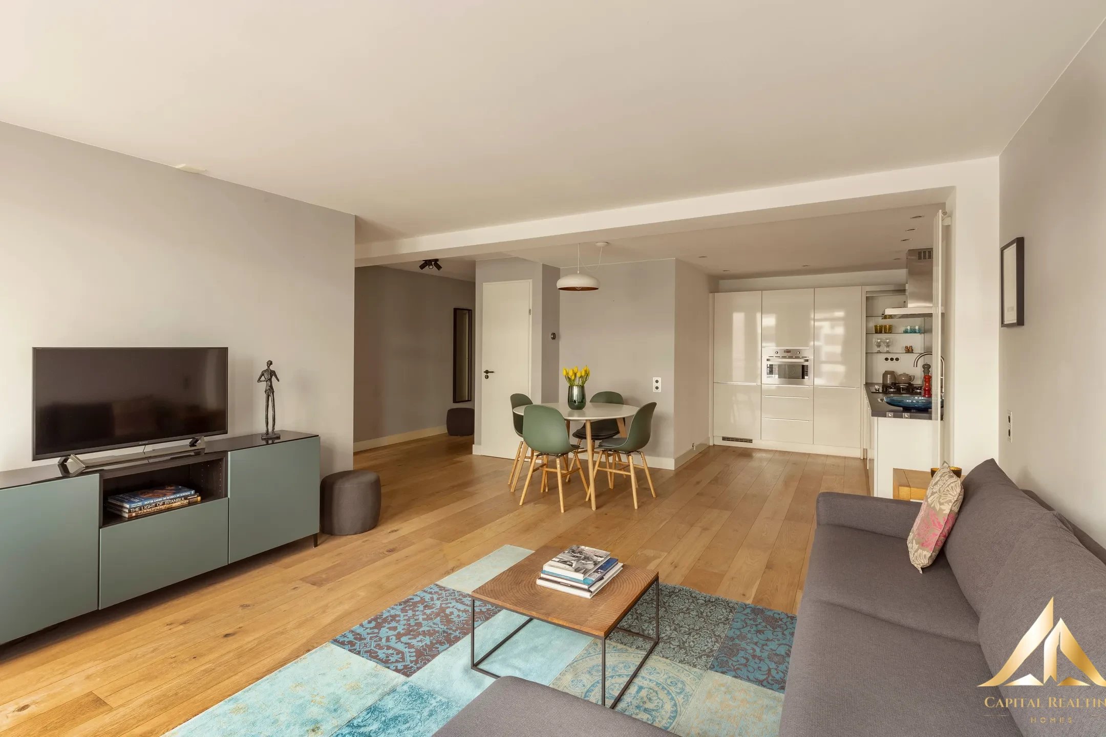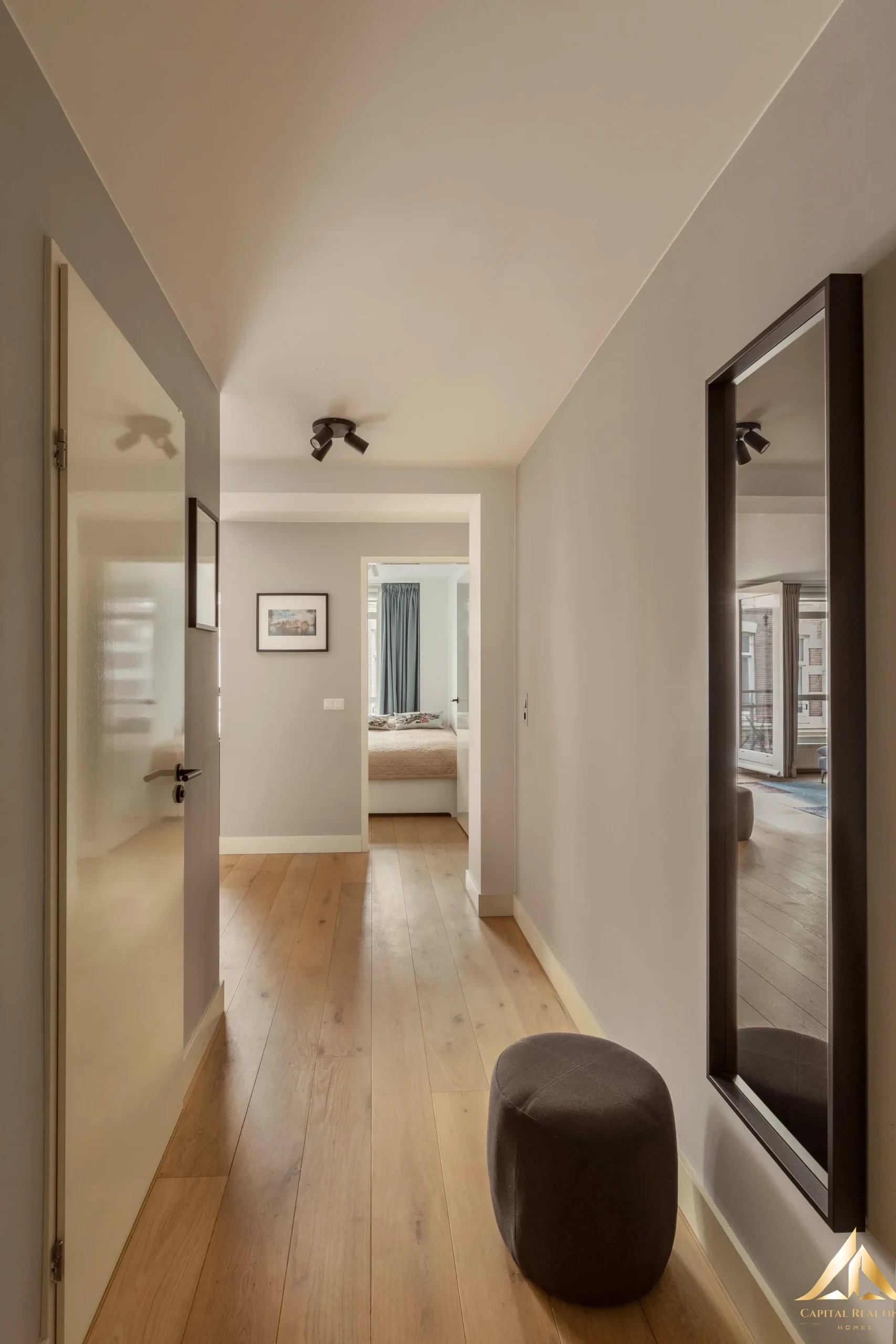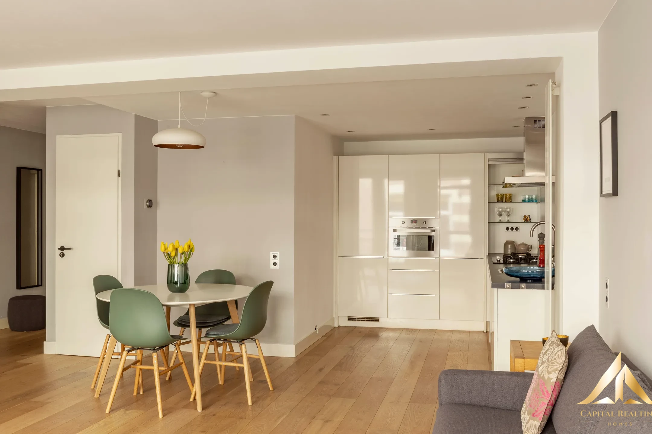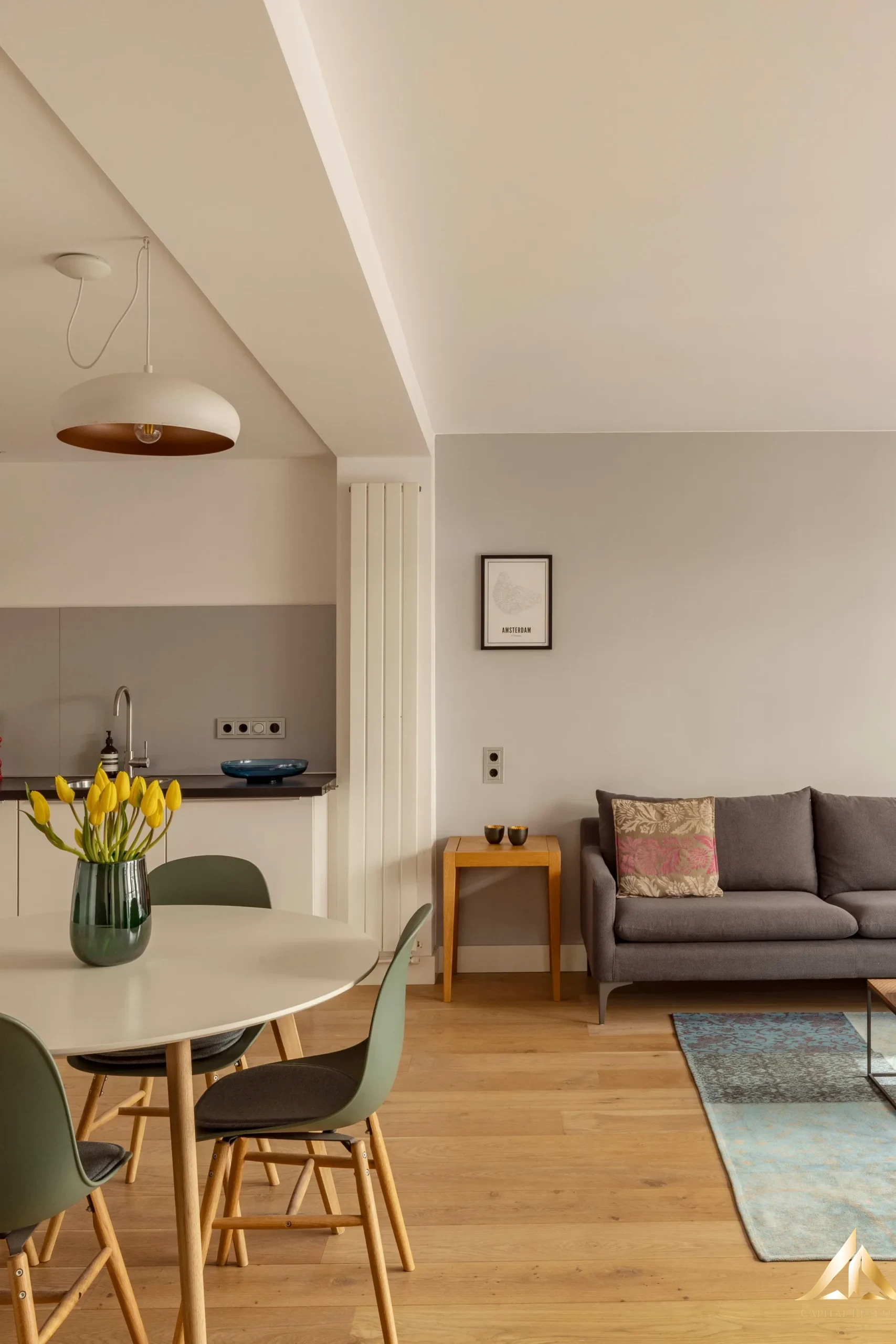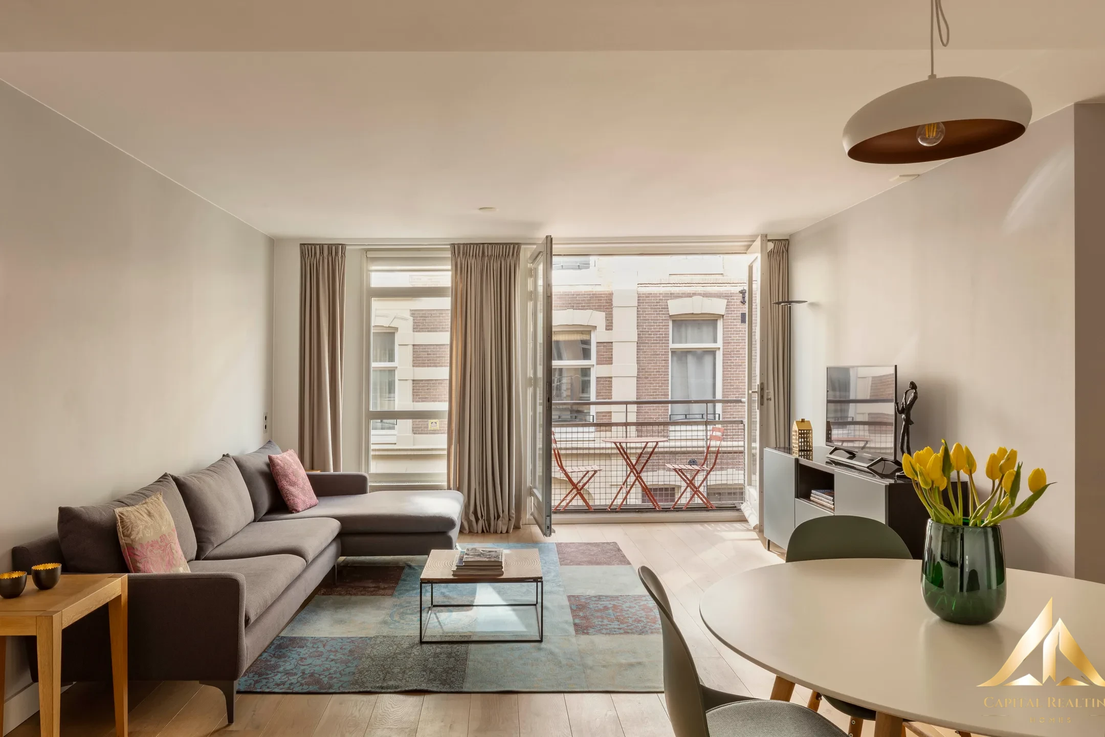 This well-laid out apartment of approximately 67 m² with two bedrooms and a balcony, located on the first floor of a well-kept residential building, is located in the quiet Rustenburger neighborhood in the popular Pijp neighborhood. The house has a spacious and bright living and dining room with large windows and an open kitchen. There is a beautiful wooden floor throughout the apartment. In addition, there is a private storage room and a shared bicycle shed. The apartment is located on private land. A parking space is also offered with the house, for sale separately for € 75,000,-. A short distance away are the Van Woustraat and the Amstel. Layout: Through the central entrance of the building, the communal hall is reached, which gives access to the courtyard garden. From here, the staircase leads to the first floor where the entrance to the apartment is located. The house opens into a hall that provides access to the various rooms. At the front is the living and dining room, a spacious and bright living space with large windows that provide pleasant light. The width of the space makes it possible to enjoy a comfortable seating area and a generous dining area. From the living space, patio doors give access to the balcony, a pleasant outdoor space overlooking the quiet street. At the rear is the luxurious open kitchen, equipped with various built-in appliances, including an oven and a five-burner gas hob with separate extractor hood. In addition, the kitchen has plenty of practical storage space. There are two bedrooms at the front of the apartment. The master bedroom offers ample space for a double bed and wardrobe space. The second room is perfect as a work, guest or children’s room. Both bedrooms have ceiling-high windows, which provide pleasant light. The bathroom has a modern finish and is equipped with a sleek washbasin, a spacious walk-in rain shower and connections for both a washing machine and a dryer. A separate toilet is also accessible from the hall. In the basement, the house has a spacious private storage room and on the ground floor there is also a shared bicycle shed.