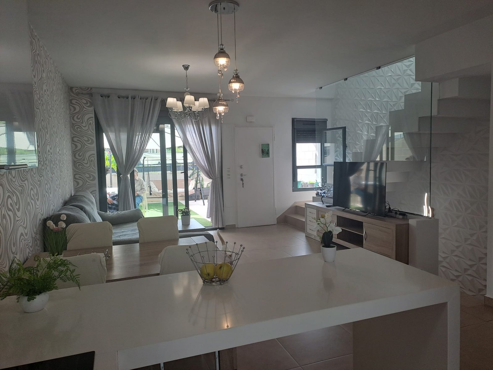 A modern townhouse for sale with a built area of 197 m². The duplex offers three bedrooms, three bathrooms, and an open-plan kitchen combined with the living room. The kitchen has access to a private patio, while from the living room there is a staircase leading down to the basement level, where the garage is located. A rooftop solarium is situated on the roof, and there is an additional terrace at the entrance to the house.