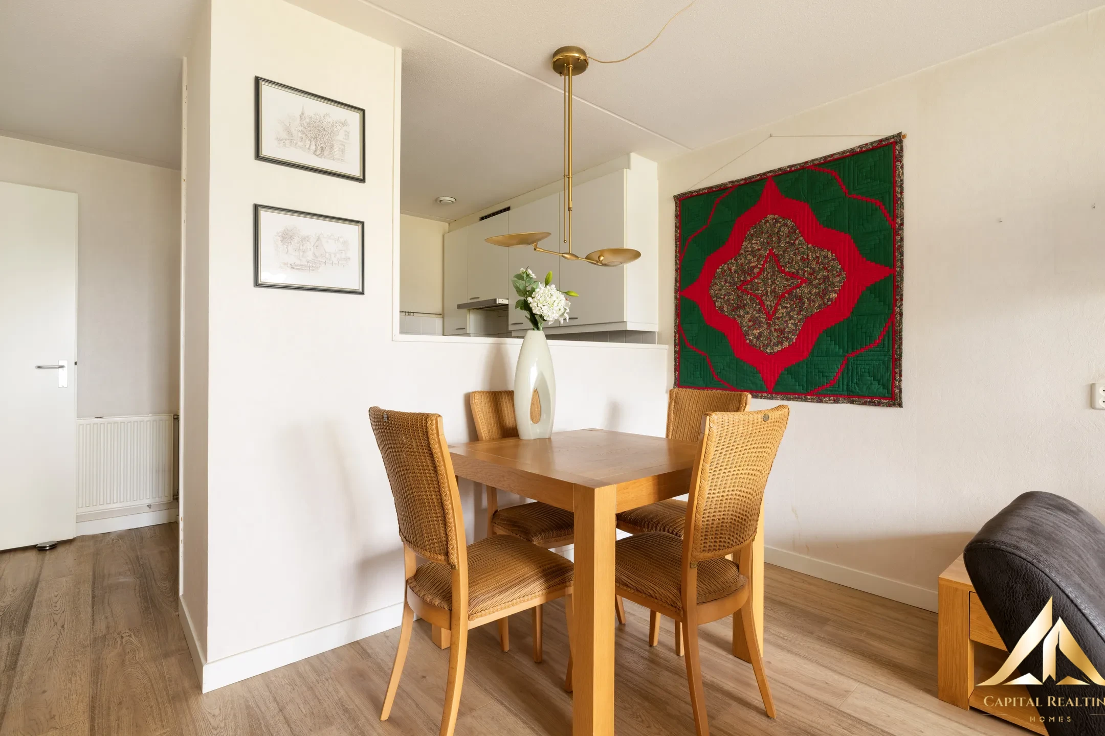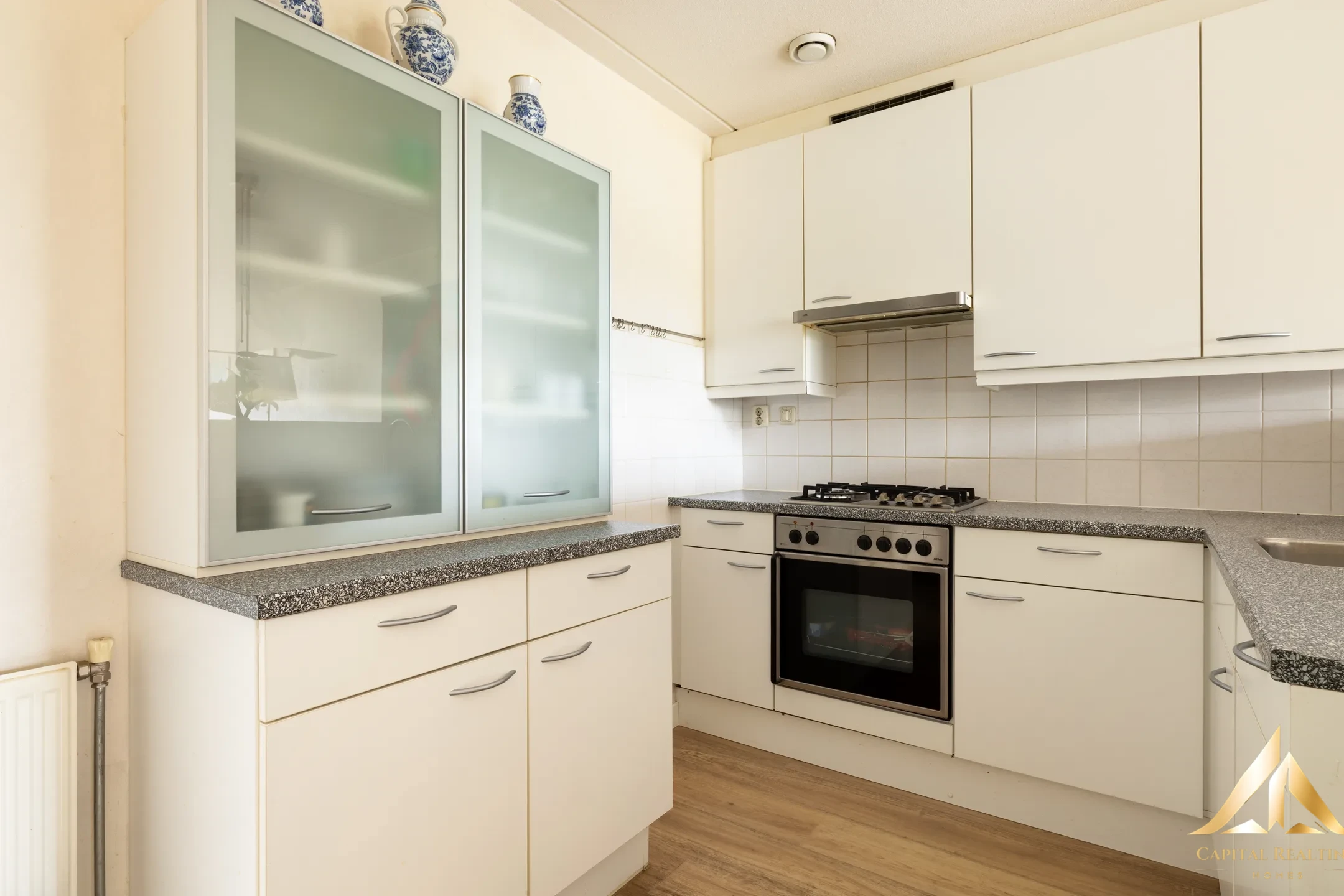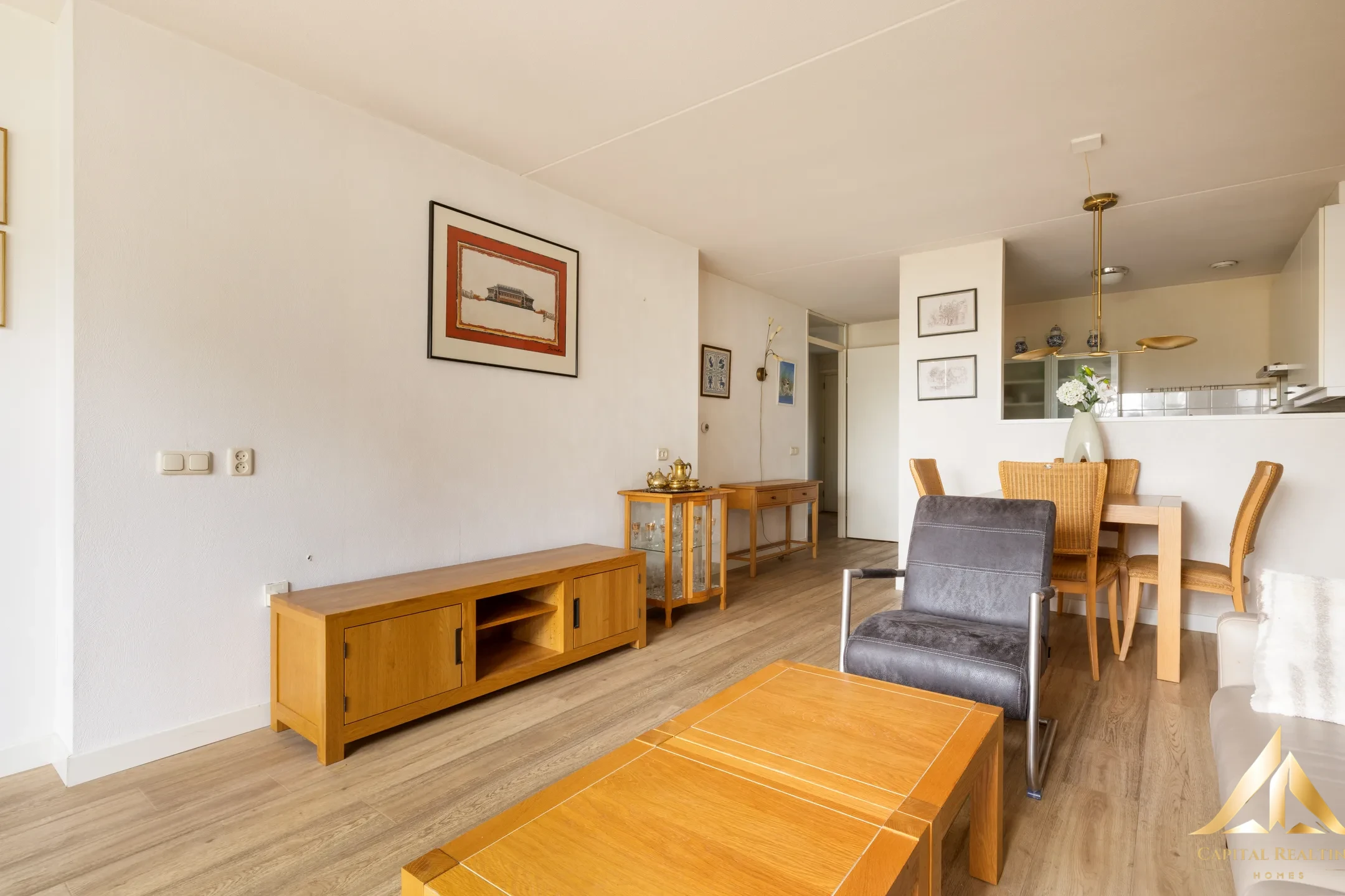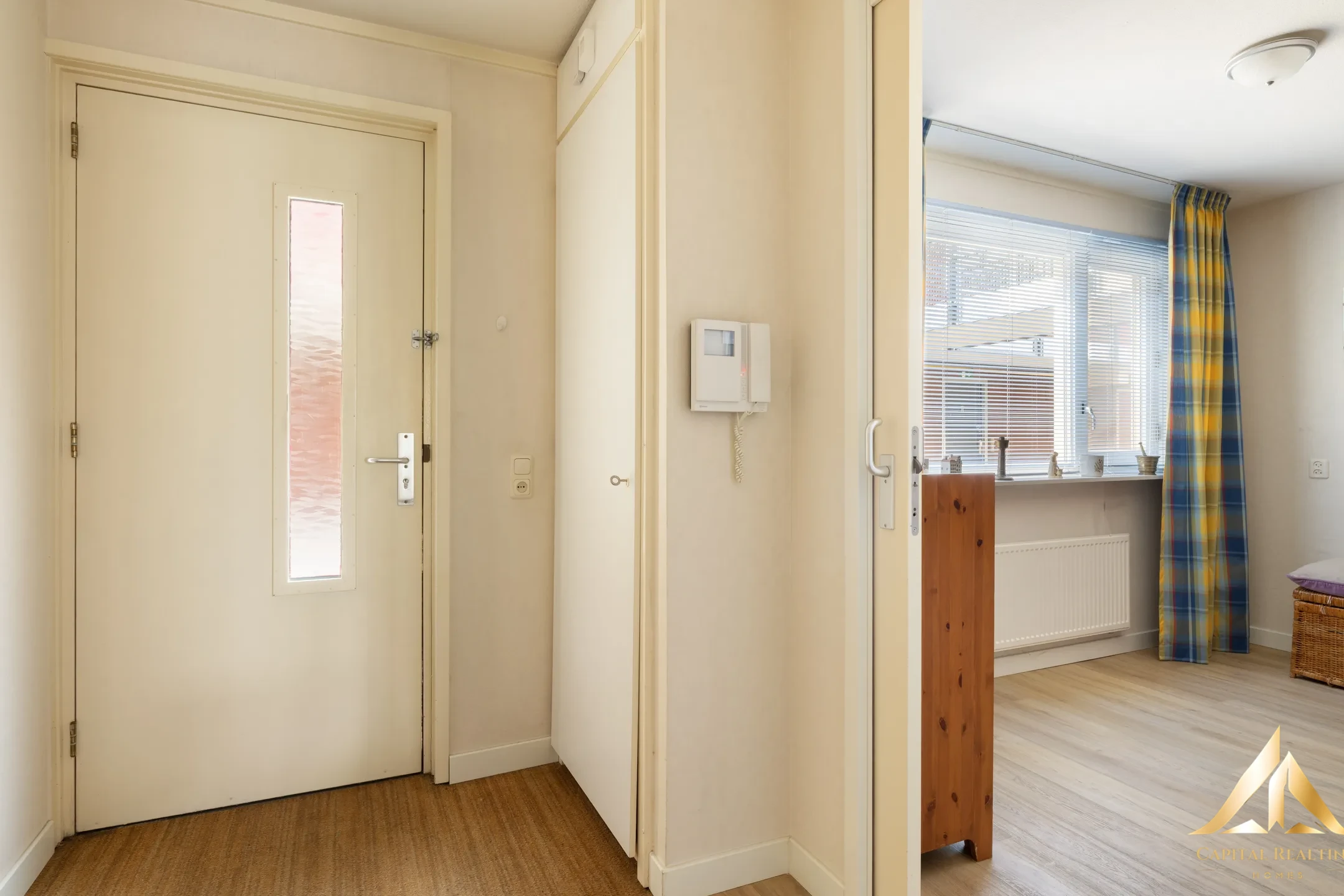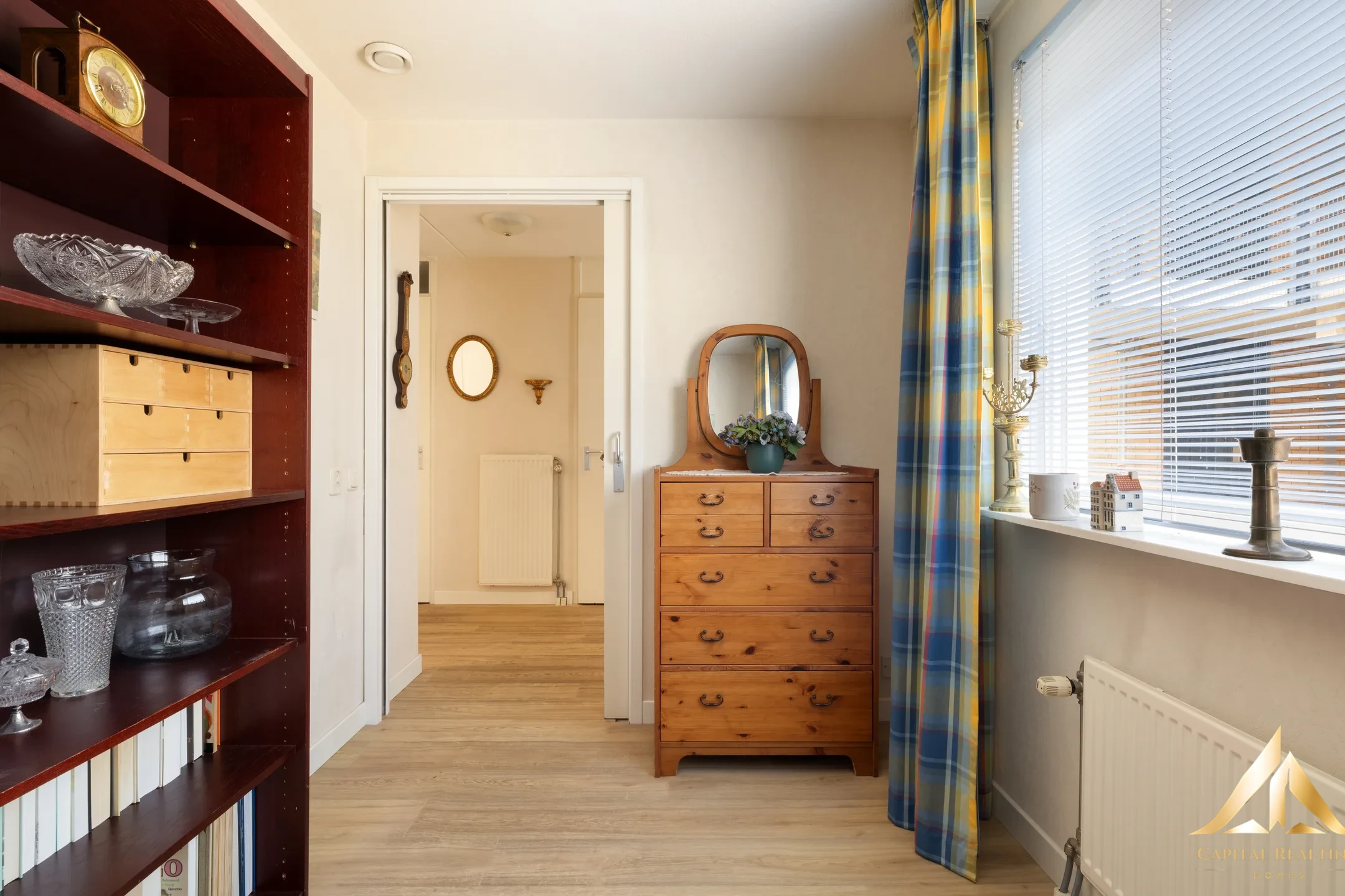 The building is very well maintained and is known for the beautiful courtyard garden with seating areas, where residents can meet each other or quietly enjoy the greenery. Thanks to the smart ventilation system in the glass roof and facades, the climate in the complex is always pleasant. The complex has various facilities, such as an elevator, a closed entrance with intercom and doorbell board, a communal bicycle shed, a space for waste containers and a shared activity room. There is also a hardwood jetty on the main waterway. Layout Through the entrance you enter the hall with meter cupboard and a practical storage room with the central heating boiler and mechanical ventilation unit. There is a separate toilet with hand basin. At the front there is an extra bedroom/hobby room and there is access to the bathroom. The simple but neat semi-open kitchen is designed in a U-shape. While cooking, you can keep in touch with your guests in the living room. This garden-oriented living room offers enough space for both a sitting and dining area. There is also access to the second bedroom from which the garden is accessible and the bathroom. The bathroom is equipped with a shower, washbasin and connections for washing machine and dryer The garden is a quiet place to relax in the morning sun, it is adjacent to a back entrance owned by the VvE.