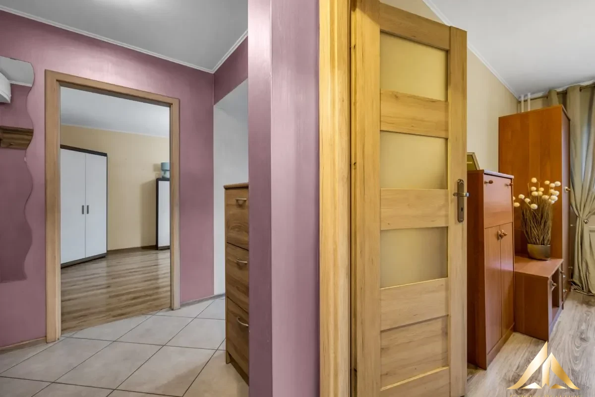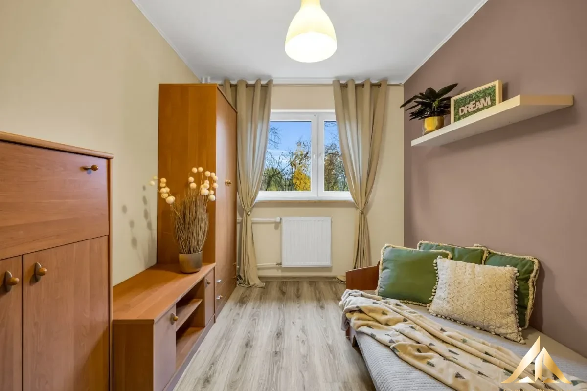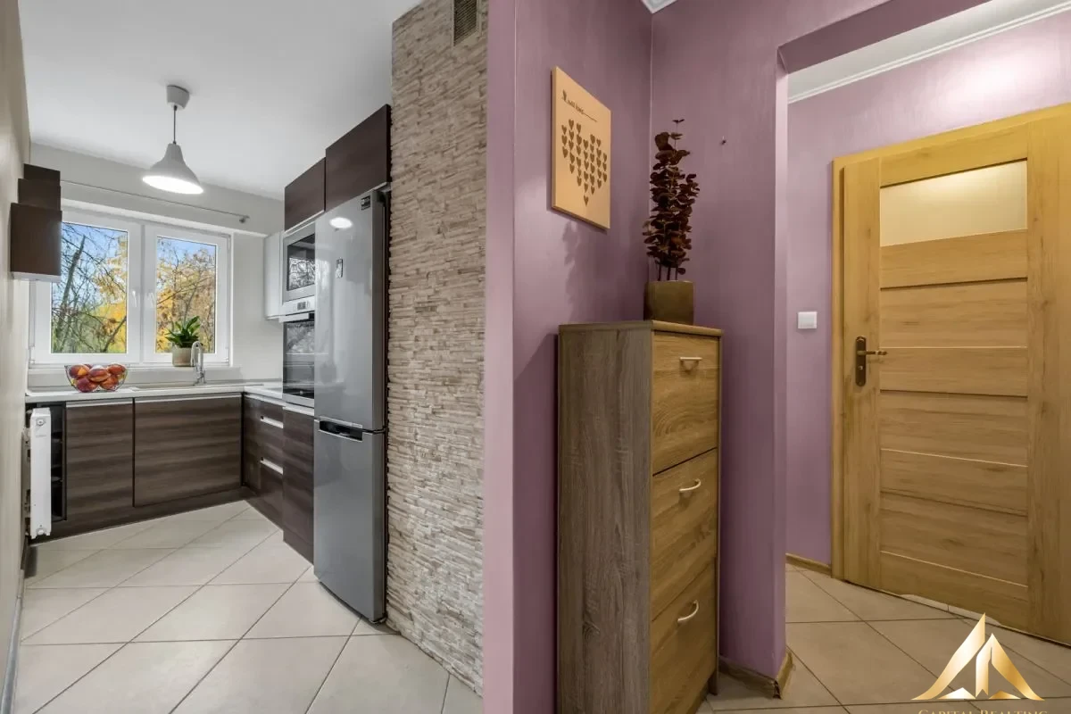 We offer for sale furnished, very functional, ready to move in 2-bedroom apartment located on Bokserska street in Mokotow district. The apartment is located on the 1st floor of a 10-story residential building from 1970. The building underwent a complete modernization in 2015. Windows, electrical system, plumbing and widny were replaced. The investment has monitoring and security which makes it safe. The investment’s neighborhood is quiet and peaceful with a developed service and commercial infrastructure, numerous stores, restaurants and meeting places. In the immediate vicinity there is Galeria Mokotów, Dolinka Sluzewiecka Park, as well as Roman Kozlowski Park with the characteristic Kopa Cwila and an office basin at Marynarska/Domaniewska street. Just a 5-minute walk from the block are bus stops, from where you can easily get to other districts of the city, to the subway station, Chopin Airport or the Central Railway Station. The property has a very versatile character, will work well as the first apartment for a single, student or couple, but will also very quickly find its tenants and will be a good investment for rent