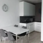 The apartment comes partially furnished, including custom-made kitchen furniture and high-quality appliances like an oven with an induction hob, dishwasher, extractor hood, and fridge. The living room is tastefully furnished with a sofa, coffee table, armchair, wardrobe, and TV cabinet, providing an inviting space for relaxation.