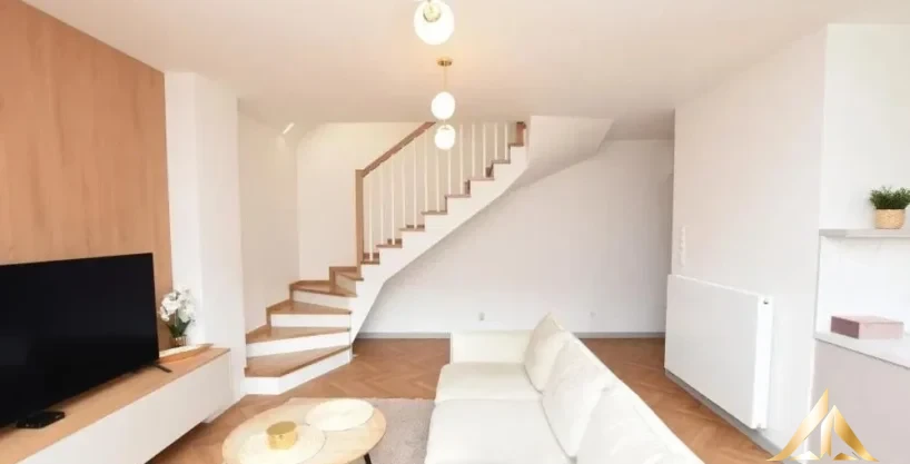 Inside the apartment, you’ll find a practical layout that optimizes every inch of space. The ground floor encompasses a generous living room with a kitchenette that opens up to the garden, a convenient WC, a communication area, and stairs leading to the first floor. Upstairs, you’ll discover a comfortable bedroom, a versatile room, a well-appointed bathroom, additional communication areas, and stairs.