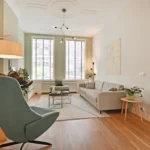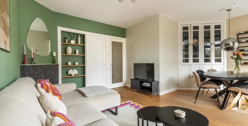 Living in a lively and central location in Bos en Lommer with an unobstructed view at the front and a lovely balcony on a quiet courtyard garden! This attractive apartment on the second floor at Jan van Galenstraat 66-II combines character, light and a very good layout. The house is a 2-room apartment (former 3-room) with a large bedroom and characteristic living room that covers the full width at the front. The apartment was completely renovated internally a few years ago and has an energy label C. Layout Through the well-kept communal staircase you reach the house on the second floor. Entrance in the central hall with access to all rooms. Here is the neat, separate toilet and a practical storage cupboard with a washing machine and dryer, as well as the utilities. The large, characteristic living room is located at the front and extends over the full width of the apartment. Thanks to the large windows and the stylish bay window, there is plenty of daylight and you have an unobstructed view over the Jan van Galenstraat and towards the Reinier Claeszenstraat. The wooden floor gives the room a warm feel and the L-shaped layout offers more than enough space for both a comfortable sitting area and a generous dining area. At the rear is the kitchen, finished in matt white and installed in 2015. The kitchen is equipped with various luxury appliances from Smeg and has direct access to the balcony. The balcony is located on a quiet courtyard garden and offers enough space for a nice seat due to the depth (approx. 1 meter). Here you can enjoy a green and unobstructed view over the surrounding buildings and the courtyard gardens. The balcony also has a handy built-in wardrobe on the right side. The very spacious bedroom is also located at the rear and has a lot of built-in closet space and patio doors to the balcony. The neat, fully tiled bathroom is accessible from the bedroom. The bathroom has a walk-in shower, a washbasin and a towel radiator and has a window for natural ventilation and daylight.