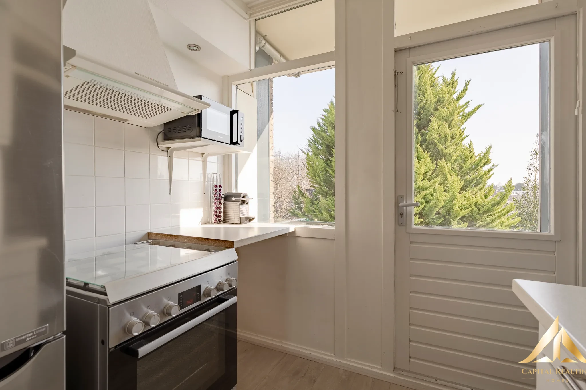 Located in a green and peaceful residential area, this cozy and bright 3/4-room apartment is situated on the third floor of a well-maintained, small-scale apartment complex. The apartment offers a pleasant, unobstructed view of the surrounding greenery. At the rear is a sunny southeast-facing balcony, where you can enjoy the sun early in the day. At the front is a second northwest-facing balcony, offering a beautiful view. The location is exceptionally convenient. The center of Wassenaar, with its various shops, supermarkets, and cozy restaurants and cafes, is just a short distance away. Sports fields, schools, public transportation, and the A44/N44 highways are also easily accessible. Additionally, Wassenaar’s beach, the dunes, and the surrounding forests are just a short bike ride away. Layout Enclosed entrance with intercom, doorbell panel, and mailboxes. The apartment on the third floor is accessible via the well-maintained stairwell.