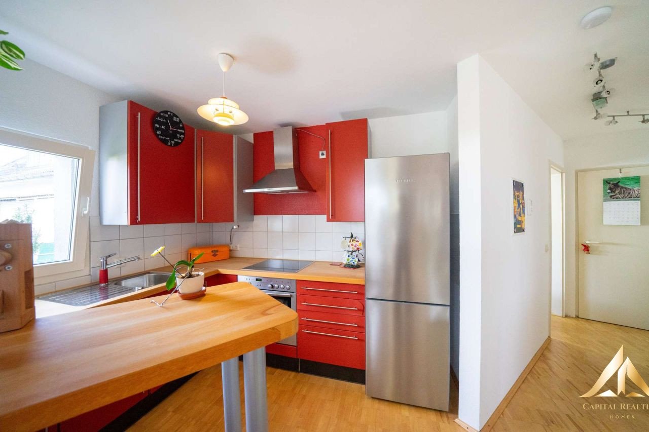 The living space of approx. 65 m² is divided into three rooms. The centrepiece is the bright, open-plan living room with direct access to the balcony in a sunny south-west orientation. Here you can enjoy the afternoon sun to the fullest. The open kitchen is equipped with a custom-made fitted kitchen including electrical appliances, which can be taken over. This floor is complemented by a modern bathroom with tub heater and two further rooms, which are ideal as bedrooms, guest rooms or offices.