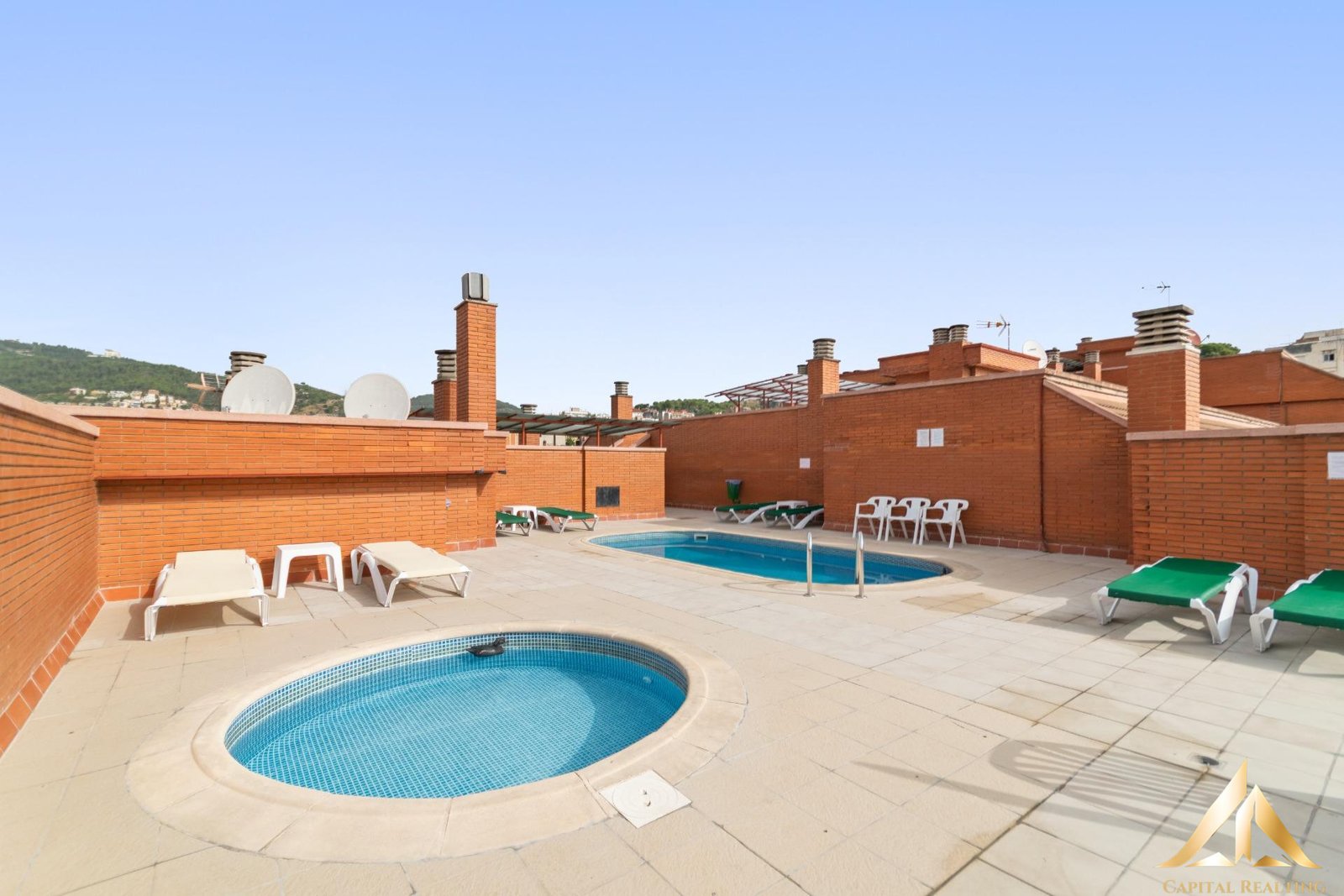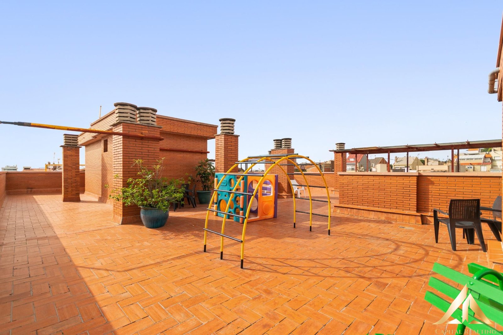 The building boasts an exceptional communal rooftop terrace with 360º panoramic views over Barcelona, two swimming pools (adult and children’s), a children’s play area, a ping-pong table, sun loungers, and outdoor seating areas with tables and chairs.