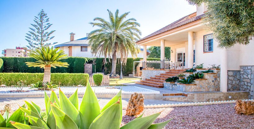 We offer you a luxurious and large villa located on the coast of Costa Blanca in the city of Mil Palmeras. Its name translates from Spanish as “Thousand Palms”. It is one of the most picturesque and amazing parts of Orihuela Costa. The city is situated between the towns of Campamor and Pilar De La Horadada. Mil Palmeras is surrounded by a 15 km coastline with beaches of beautiful soft sand and clean Mediterranean waters.