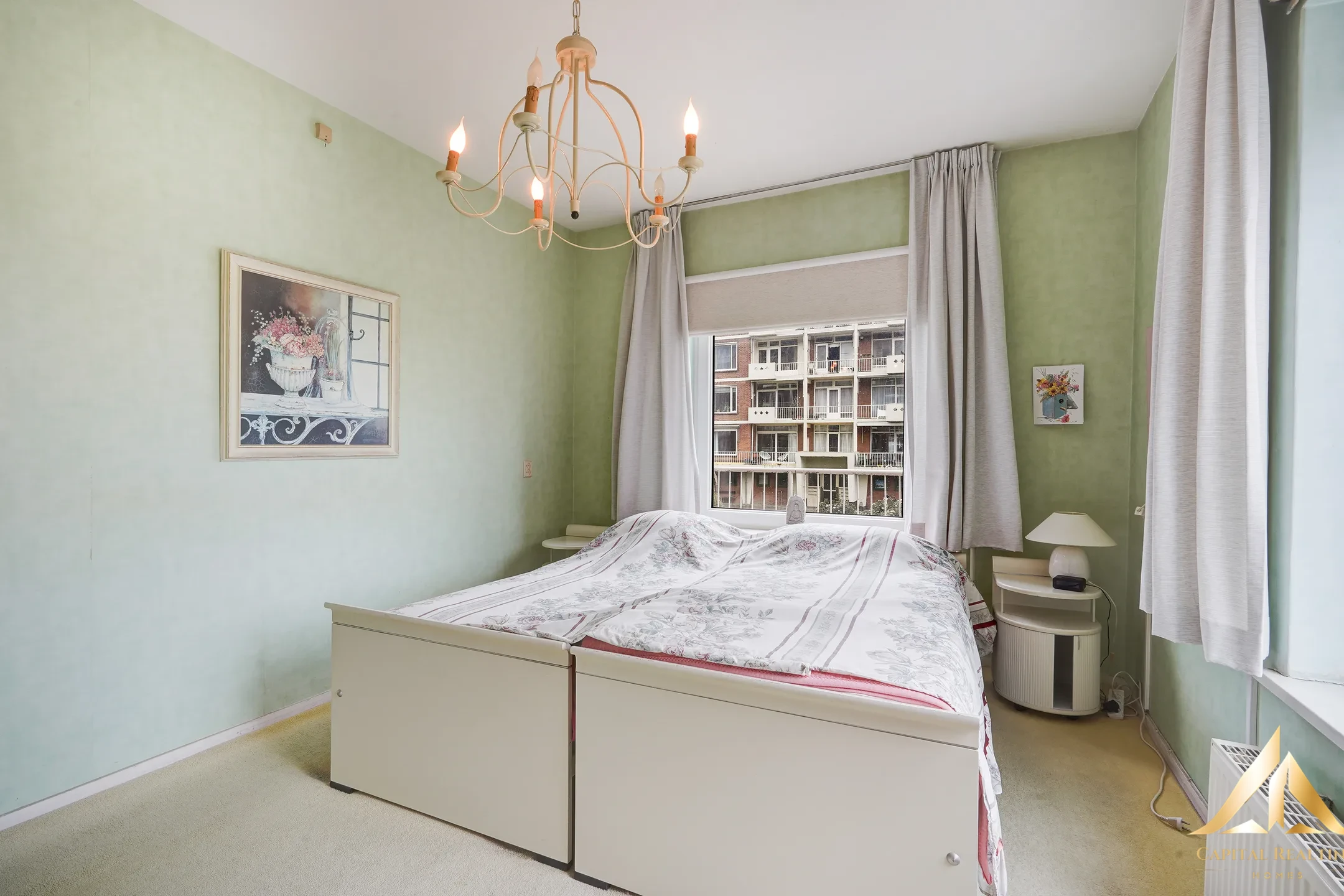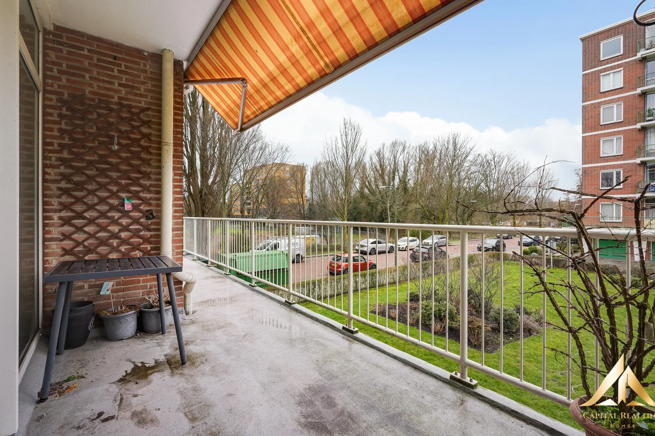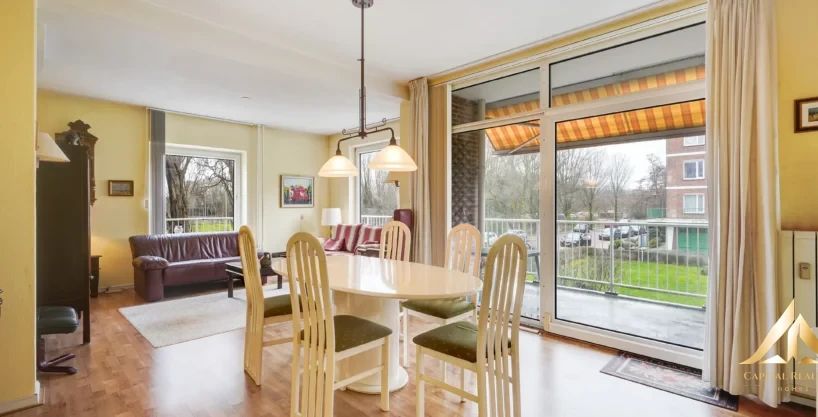 Unique 5-room corner apartment on the 1st floor with 3 bedrooms and a sunny balcony (southwest) all around at the front with a fantastic panoramic view. Private bicycle storage in the basement. LAYOUT: Closed porch with mailboxes and doorbells, videophone system, elevator or stairs to 1st floor. Entrance of the apartment, spacious hall with floor tiles, meter cupboard and toilet. Access to attractive living/dining room with beautiful panoramic views. Through sliding doors access to the spacious balcony with electric blinds on the southwest. Spacious front bedroom with sliding doors to the balcony. Kitchen with various appliances such as 4-burner gas stove, extractor hood, fridge / freezer and door to the balcony. Simple bathroom with shower and sink. Spacious back room with access to the balcony. Next to it is a rear bedroom with a single door to the balcony. Private storage room on the ground floor.
