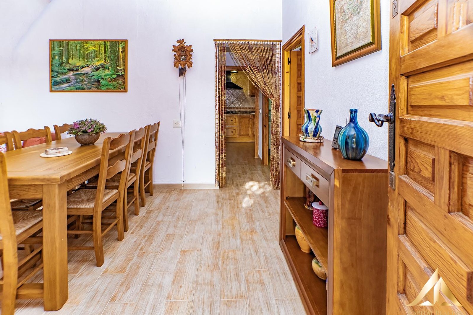 The south-facing house features wooden doors and windows, which add warmth and authenticity. It has three bedrooms, one bathroom, a living room with a wood-burning fireplace, a separate kitchen, a pantry, and a pleasant porch, ideal for enjoying the outdoors year-round.