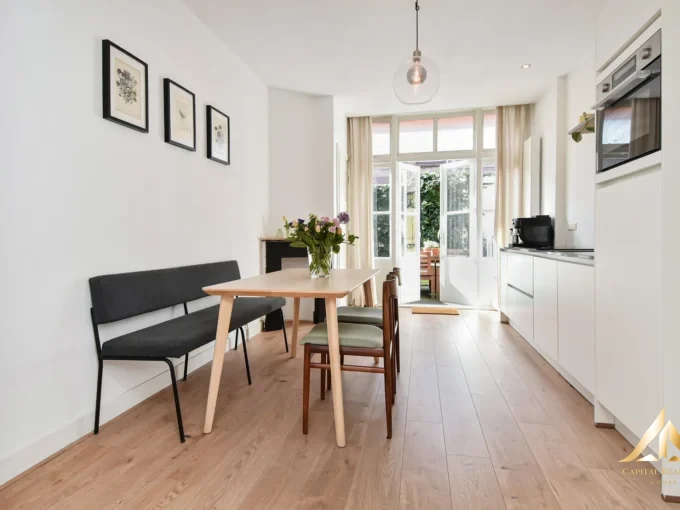 The apartment features a built-in kitchen with all necessary appliances, including a dishwasher, electric stove, and washing machine. A secure metal entrance door and double-glazed windows are installed. The apartment has undergone a high-quality, well-planned renovation with modern finishes, creating a cozy and stylish living environment.