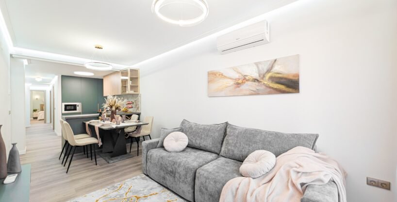The apartment has a total area of 79 m² and offers 2 bedrooms, a bathroom and two terraces, one of which is glazed. A full designer renovation has been carried out, and nobody has lived in the property since. The apartment has new windows, plumbing, wiring, flooring, walls, etc. There is underfloor heating throughout and air conditioning is installed. The price includes brand-new furniture and household appliances. This is a wonderful option for permanent living, located within walking distance of bars, restaurants, supermarkets and the main square of Torrevieja. The beach is only 800 meters away.