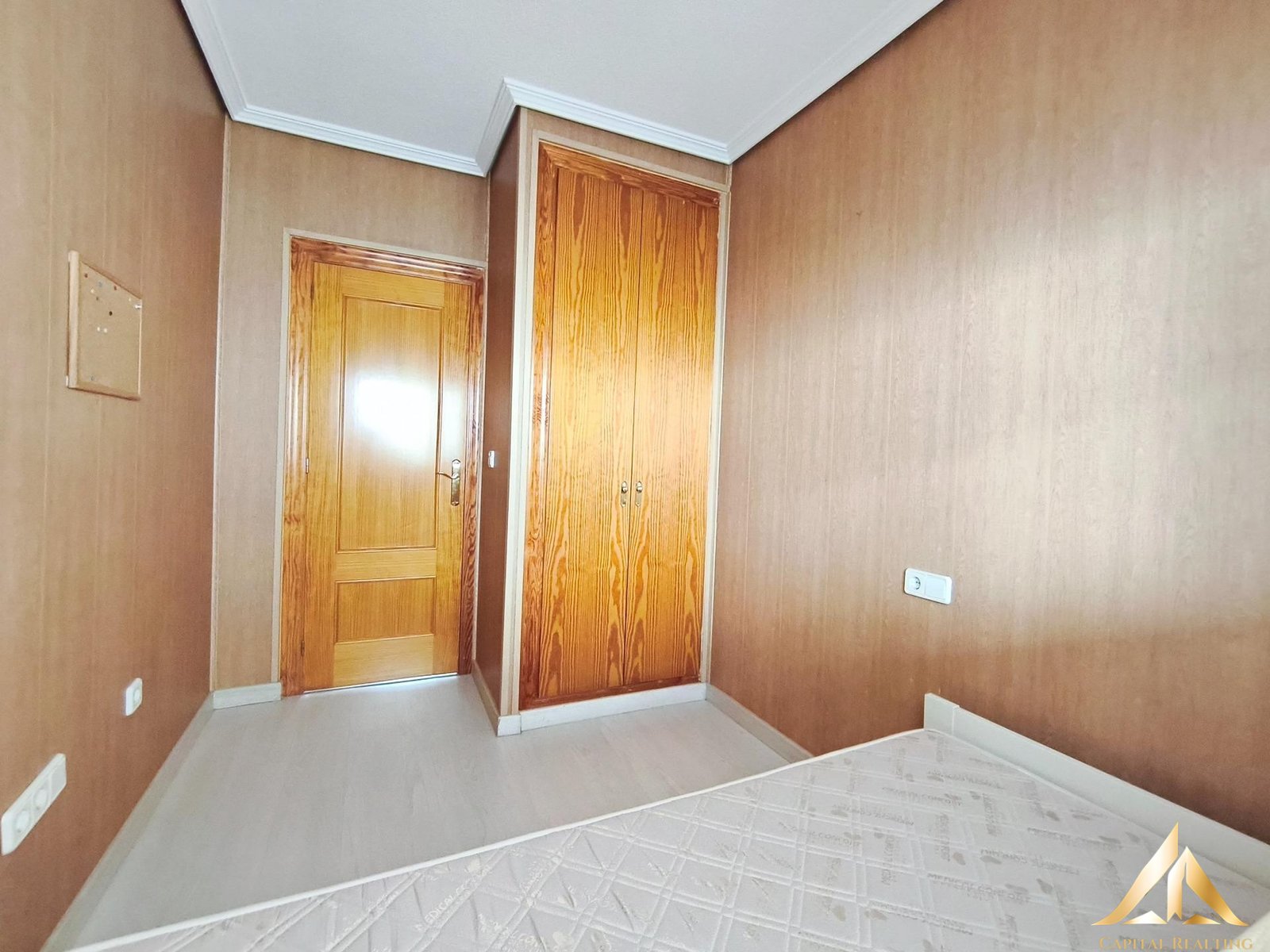 - Спальня с панелями с эффектом дерева и встроенным шкафом.
