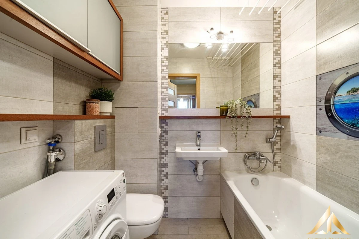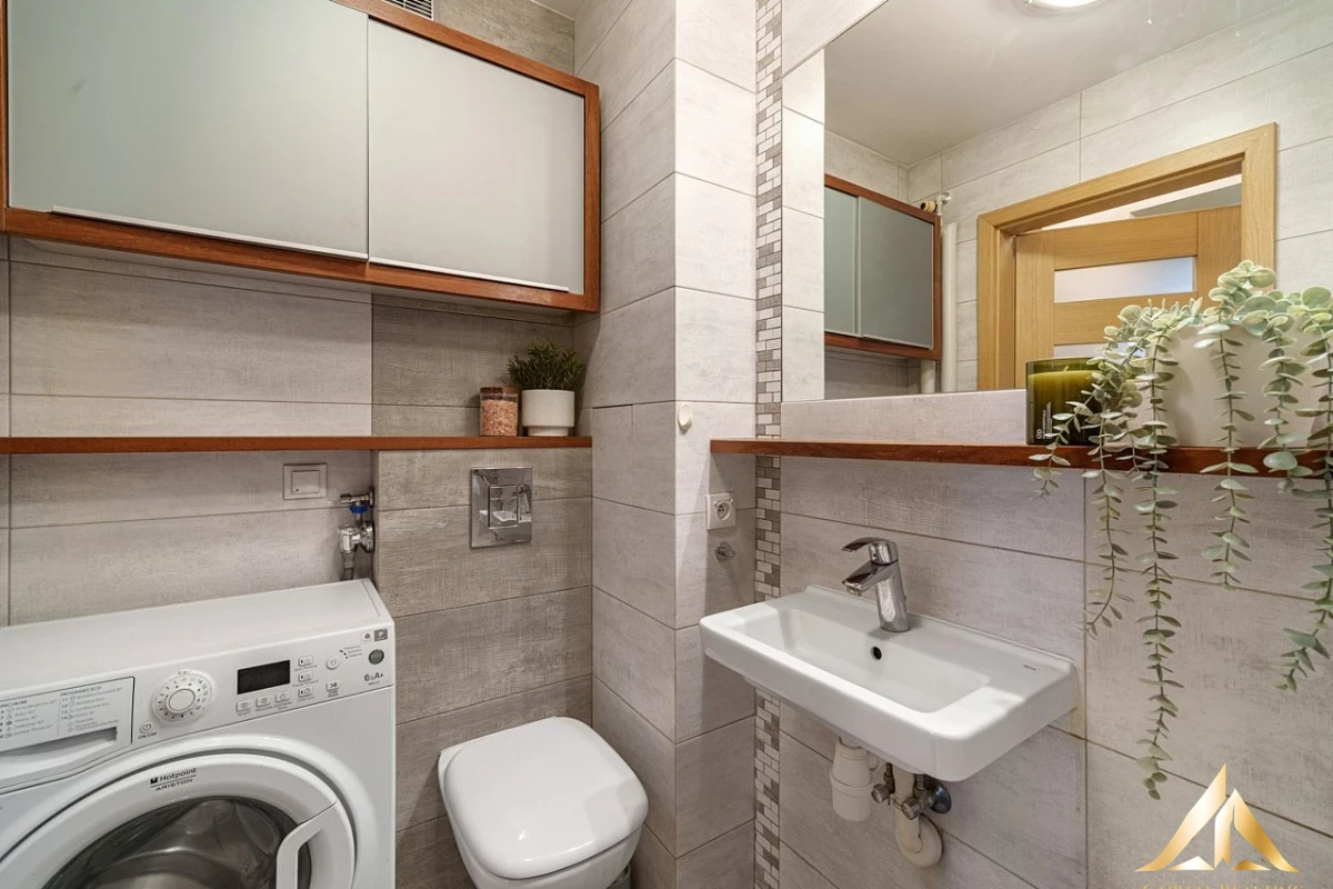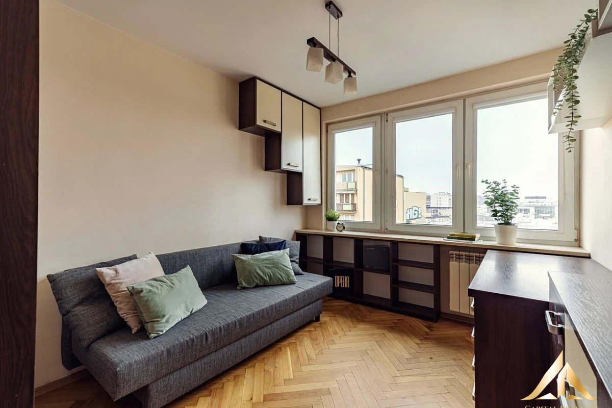 Area: 35.9 m², two non-passing rooms, kitchen with a window, fully equipped, hallway with a spacious wardrobe, well-designed bathroom with a bathtub, generous balcony overlooking the Świętokrzyski Bridge.