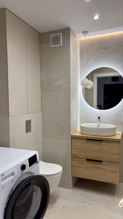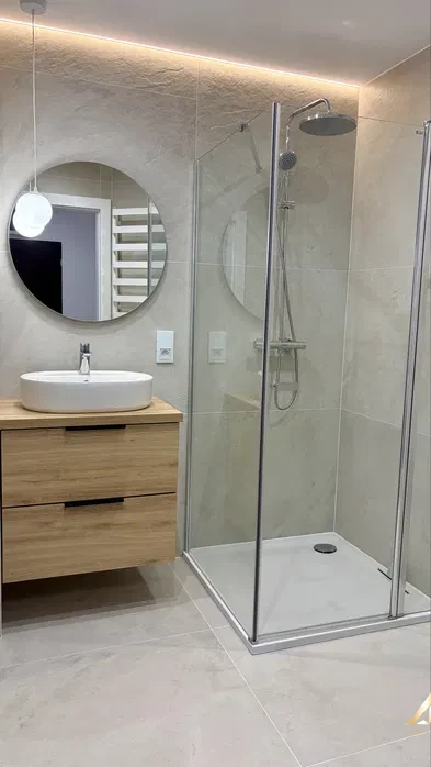Bathroom fittings Grohe and Roca high-class shower tray and cabin, Italian large-format tiles 150×70, built-in Egger board on request.
